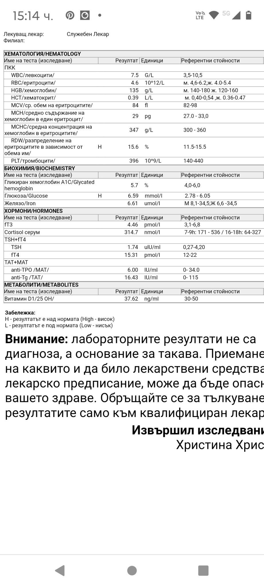 Sunny_82, предполагам питаш за мнение. Моето е, че имаш хипофунция, преддиабет и ниско желязо. Няма Б12 и вит. Д, но няма да се учудя ако и те са ниски. Обърни сериозно внимание на здравето си! Тези стойности на глюкоза на гладно никой ендокринолог няма да подмине. Имаш нужда от хранителен и двигателен режим, метформин (за съжаление няма да минеш без него) и левотироксин.
