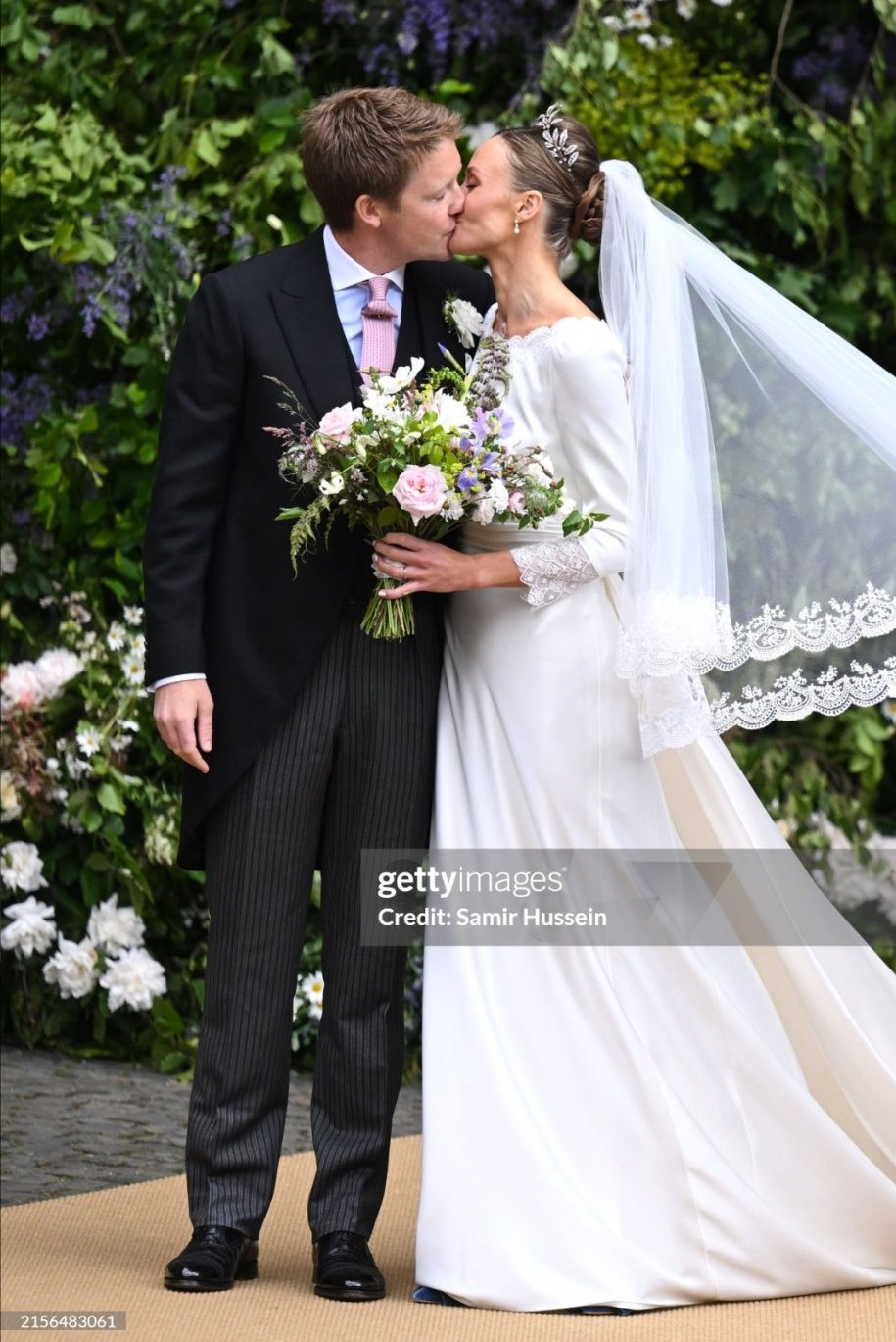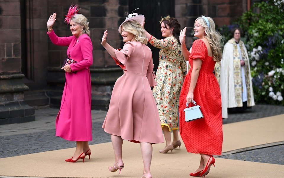Двете дами след майката на младоженеца /с роклите в нюанси на розово/ да не би да са сестрите му? Техните тоалети определено не ми харесват, особено дамата с диадема и чанта в небесно синьо, много ежедневен аутфит, неподходящ за такова събитие, все пак сватбата на годината е това.