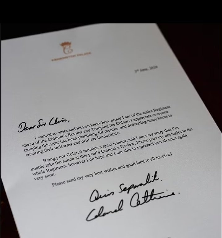 Принцесата на Уелс с извинително писмо към Irish Guards,казвайки: „Надявам се, че ще мога да представлявам всички вас много скоро"