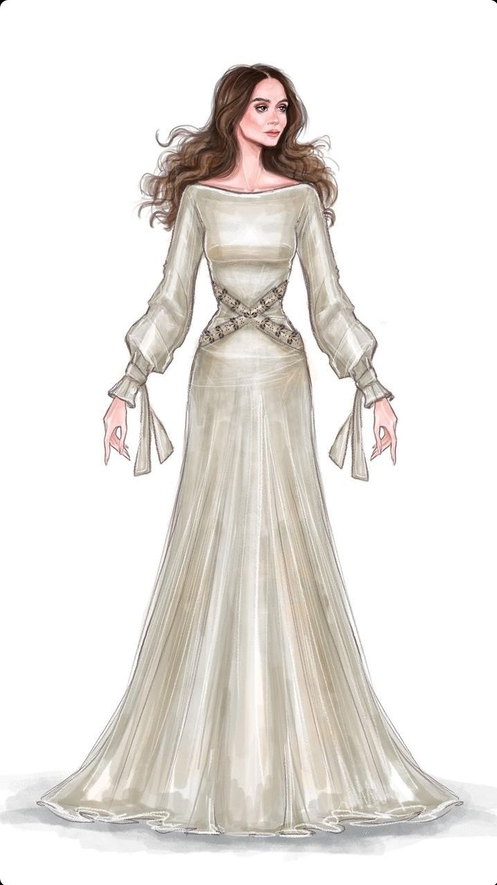 Нейно Величество, за да обсъдят дизайна, през скицирането, намирането на подходящи платове, изработването на модели, шиенето и бродерията, всяка стъпка беше извършена с най-голямо внимание и грижа към детайла от опитни кутюристи.