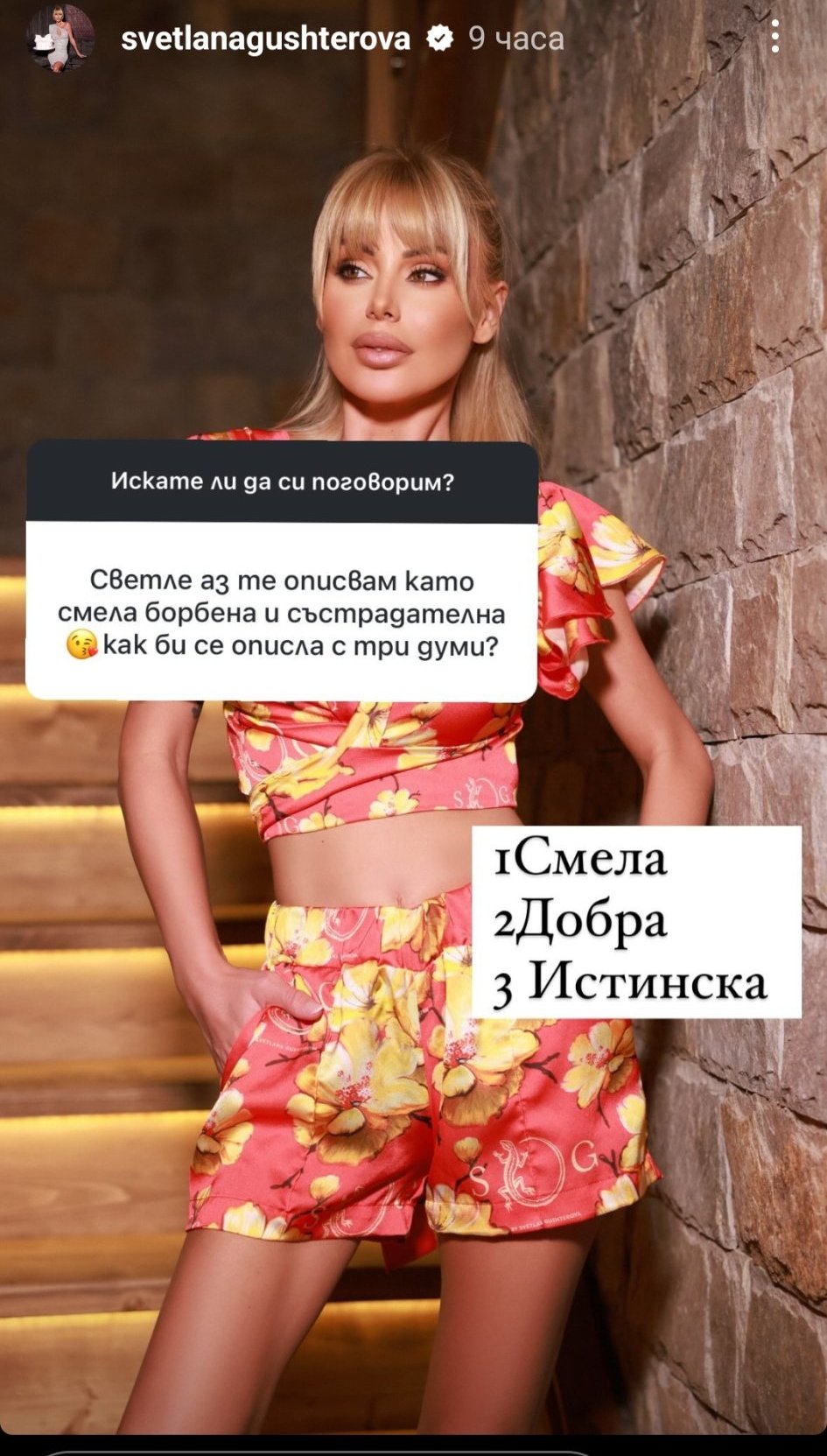 Тя пък точно Светлана, ако е истинска... Толкоз прекроена външно, колкото се е опитала да подмени и същността си. Ох, милата, истинска била. Всъщност видяхме колко е истинска в онова интервю, толкова истинска беше, че, ако се беше отървала още мъничко, щеше да стане съвсем реализъм Joy и същността и на каруцарка и парцалеса щеше да лъсне в цялата си прелест и от бляскавата поезия щеше да се възроди колоритната проза на една какавида, която никога няма да стане пеперуда, колкото и листа от черница да изяде.