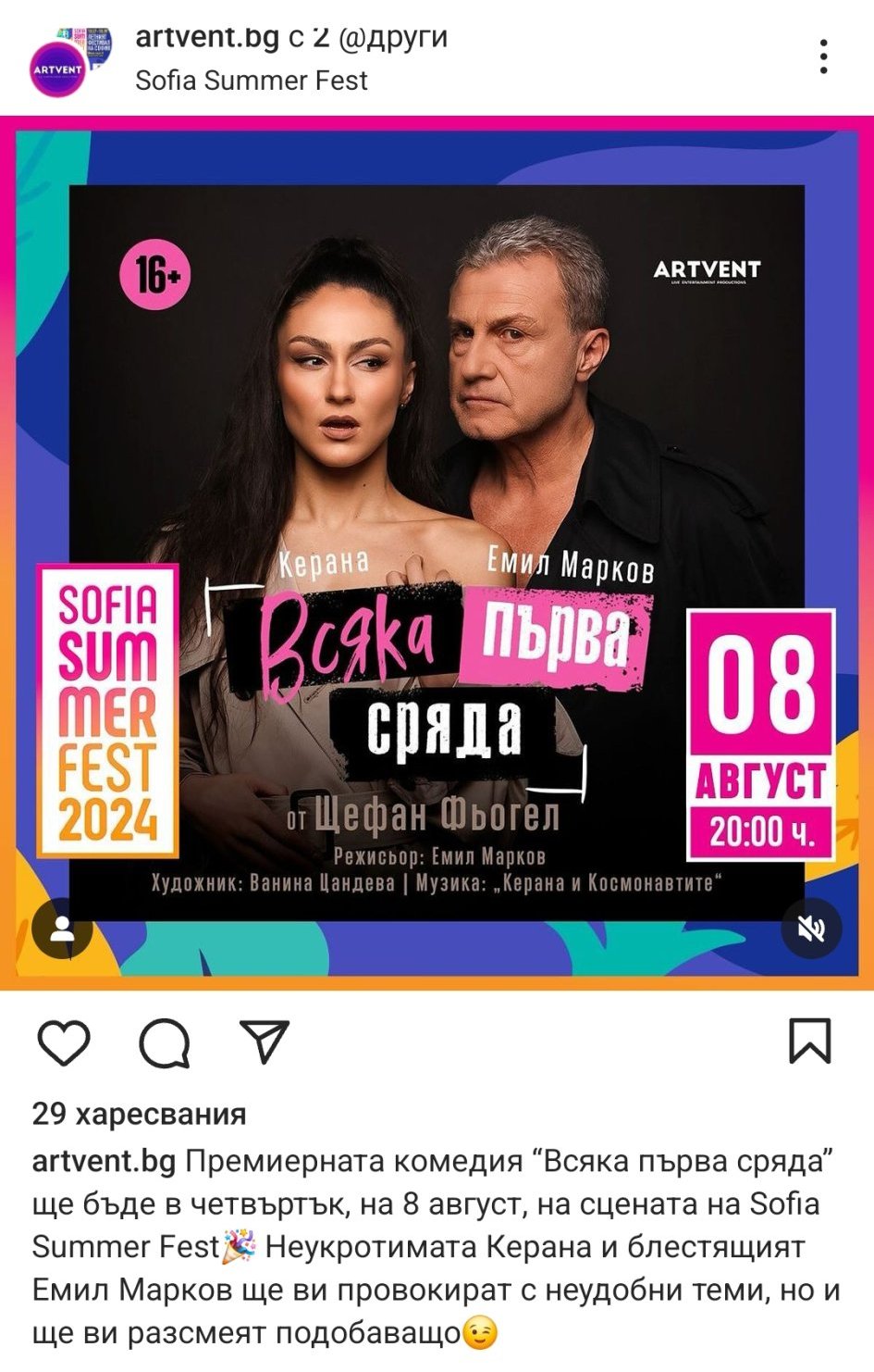 Гледала съм “Всяка първа сряда”. На мен ми хареса. Керана не е актриса, но много добре се въплъщава в ролята, която играе. Сюжетът също е интересен, с неочаквани обрати. Като цяло беше много приятна постановка.