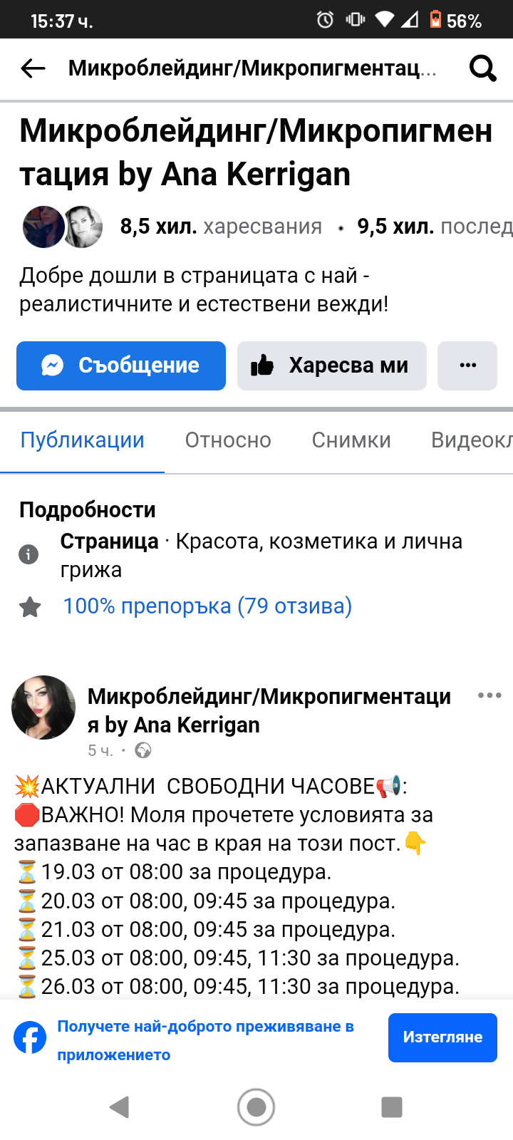 Здравейте, знам, че Ана Кериган катастрофира, но слава на Бога се възстанови и отново се върна към работа, поне така чух. Тези дни обаче не мога да се свържа с нея. Писах в страницата й Микроблейдинг във ФБ, видя съобщението и изтри страницата. Звънях по тел и затвори. Някой да знае дали ощу работи и къде се свързвате с нея?
