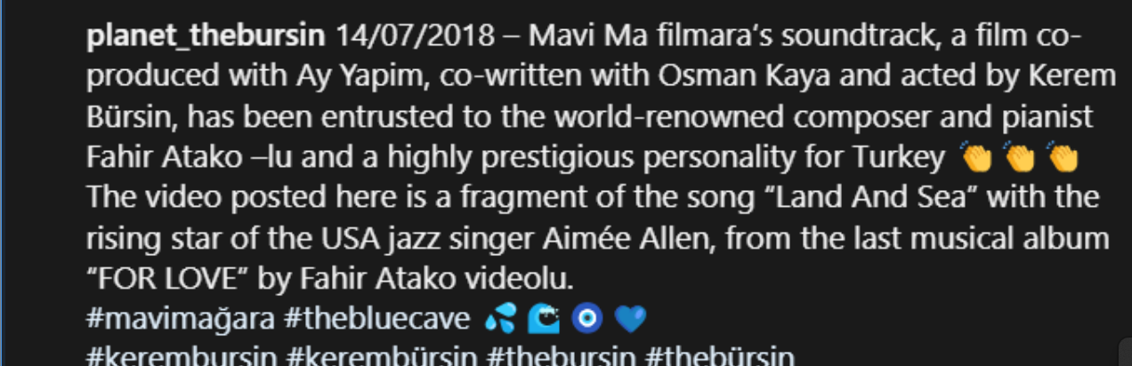 Музиката на филма Blue Cave, режисиран от Kerem Bürsin, е композирана от известния композитор и пианист Fahir Atakoğlu.
