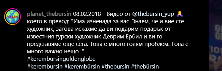 Членът на борда на "Златен глобус" и журналист Барбарос Тапан, който работи повече от година, за да се случи това важно събитие, каза: "Дадохме първата международна награда за икона в Турция, във вечния град Бодрум. Ще продължим да носим червените килими на световни марки в Турция. Най-големият поддръжник на гала вечерта за международна икона "Златен глобус" беше GAIN. Мисля, че заедно свършихме добра работа за културната дипломация."