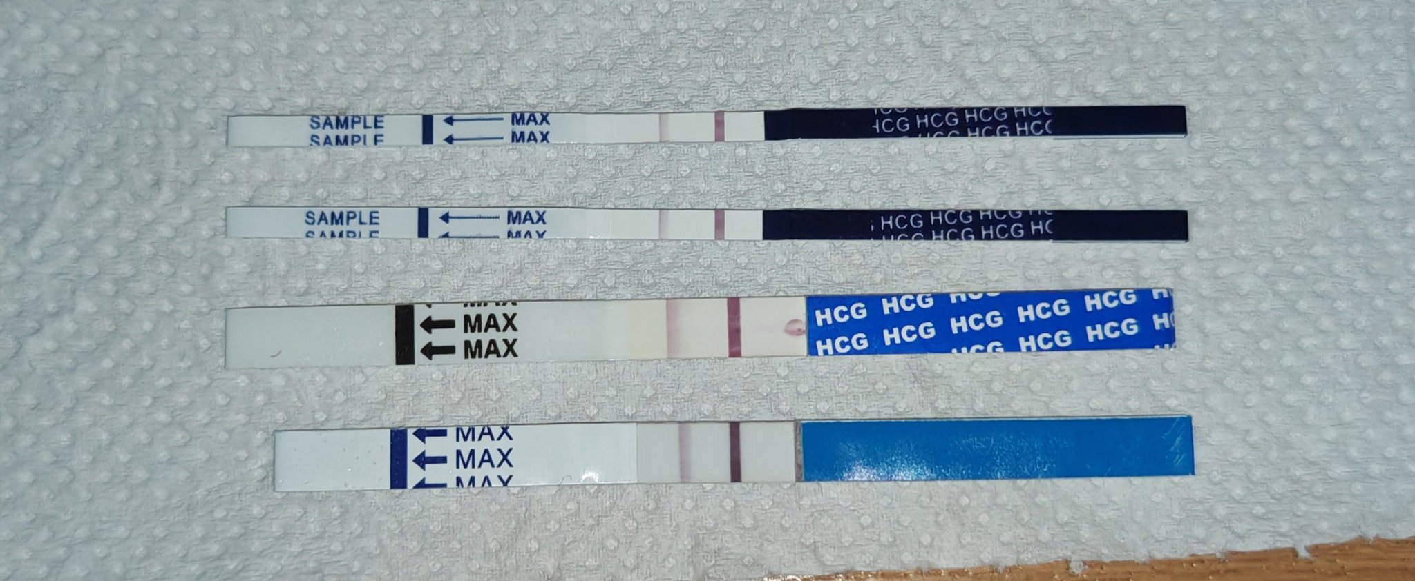 Здравейте, днес ми е 12ти ден от трансфер на два бластоциста. Трансферът беше на 31.07 на обяд. На 8ми ден имах ЧХГ 64.80, а на 10ти ден ЧХГ 110. Казаха ми, че е добре. Правя уринарни тестове, като втория тест на снимката е от 10тия ден на ЧХГ 110. Протеснявам се, че чертата не става по-наситена. Днес направих два теста - един Клиър тест(последния от снимката) и някаква измислена зелена касета. Този на последната снимка има Розова чертичка, но на касетата беше много бледа и сега много се притесних. Днес пускам кръвен, но не знам как ще издържа 🥺