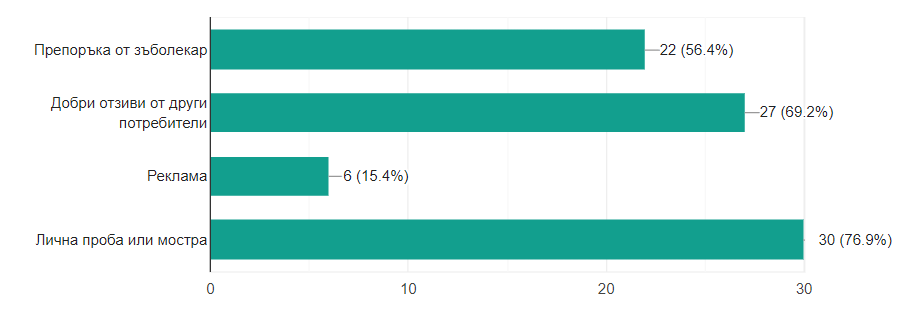 На въпроса "Каква паста за зъби използвате в момента?" 71,8% са посочили "паста за чувствителни зъби" за своя отговор. 25,6% от анкетираните са отговорили "обикновена паста за зъби", а 2,6% употребяват "паста за избелване на зъбите".