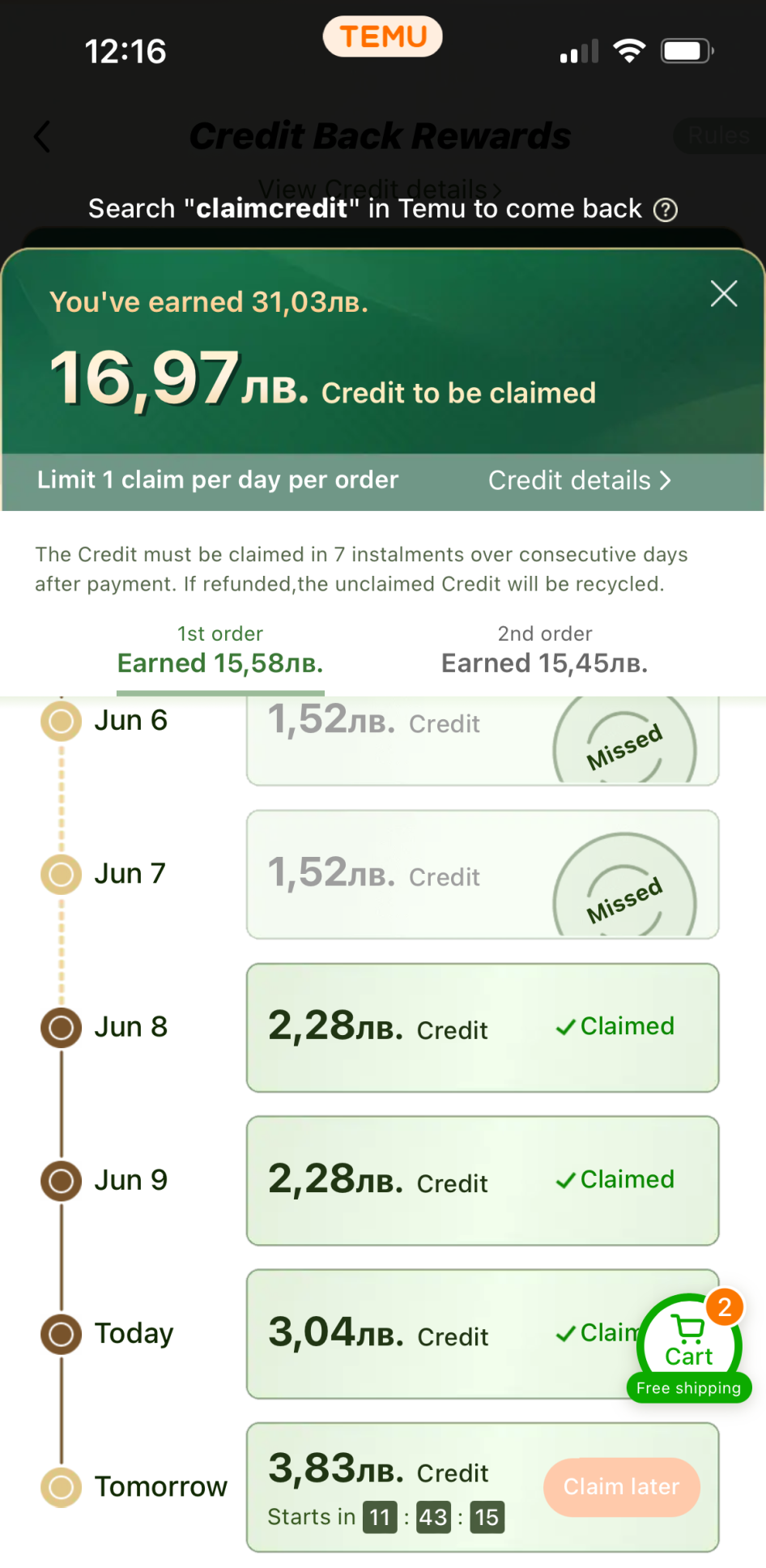 Тия уж големи отстъпки аз видях само в първата си поръчка. Един артикул до 32 лв го взех на 6 лв. После ми се пада колело, което ми е давало макс до 30% да ми върне от направената поръчка в отделни дни като сумата расте. Имам две такива активни, които ми връщат пари, защото на няколко дни правя нова. Условието е да са нещата от количката и там отдолу ти пише какъв е минимума за поръчка. Мислех, че излиза автоматично след 24 часа, за да си взема бонуса, ама не. Имам два пропуснати. За това в търсачката ги намирам в claimcredit и си ги проверявам и не чакам да ми изскочат.