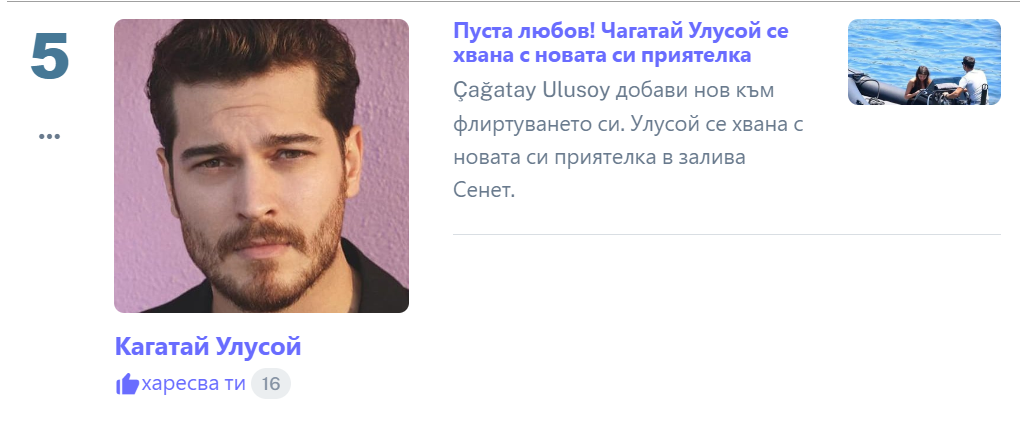А тази на ИМДБ не е излязла още. В профила му в ИМДБ пише, че е извън 5000 в световен мащаб и не мога да сметна на кое място е в Турция, защото повечето турски актьори и актриси са извън 5000. Засега Туба, Джан и Керем са под 5000 и по всяка вероятност ще са на първите три места, останалите ще ги видим, когато я пуснат класацията.