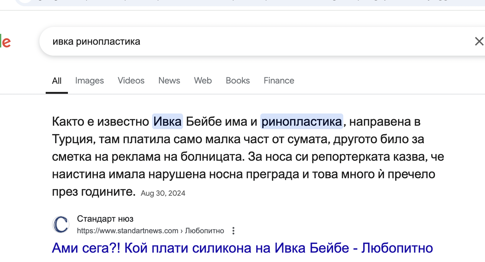 Как кога, тя има толкова много постове и интервюта по темата... Явно я следиш отскоро - рекламираше доктора от ринопластиката, която бе написала, че е бартерна; рекламира си и козметичката, която не е лекар, но поставя филъри. Ивка се гордее, че тези процедури са й почти безплатни, на бартер срещу реклама.
