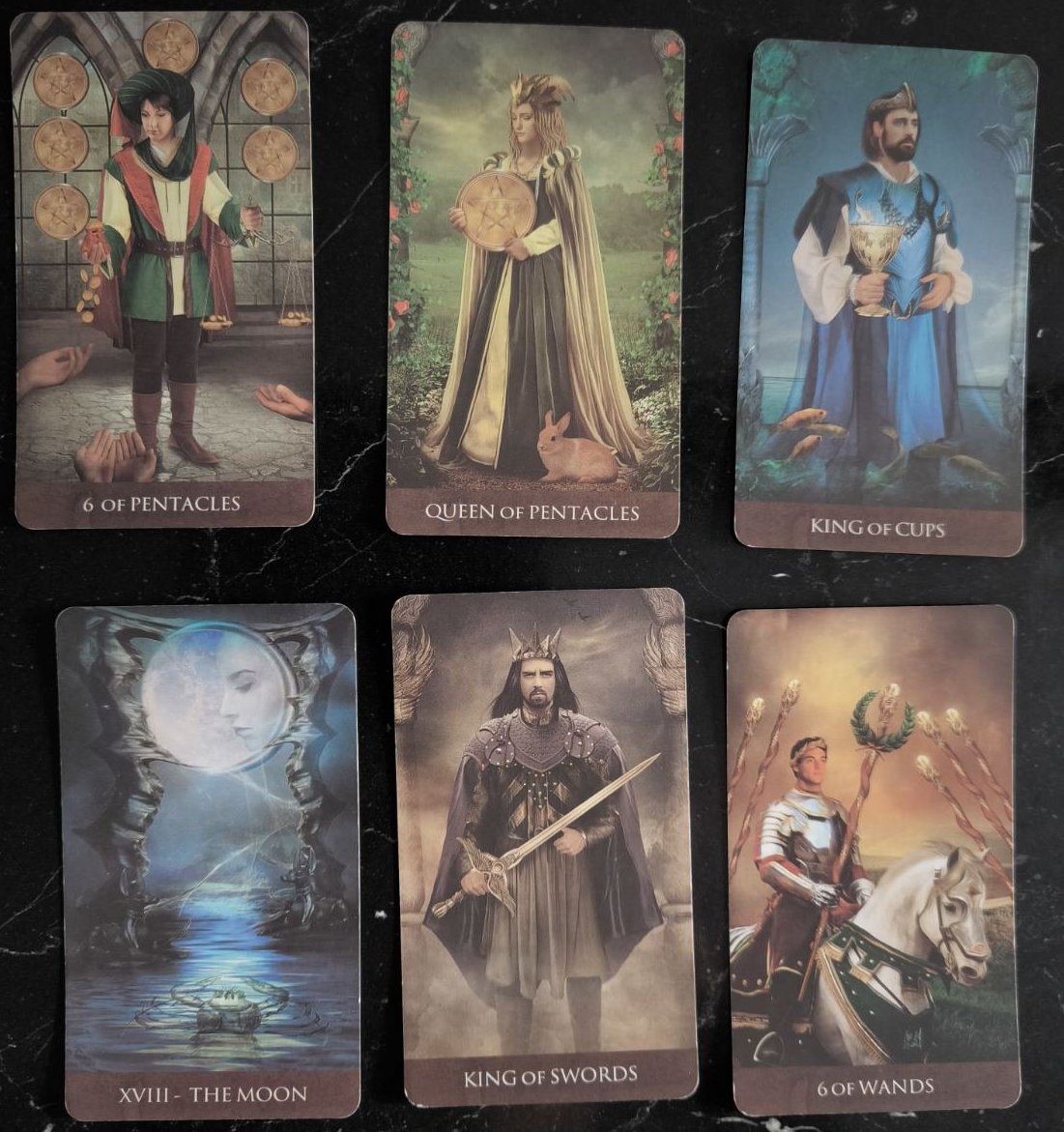 Моето тълкование е, че по 6 пентакли ще имаме щедрост, материален успех, даване и получаване на помощ или достигане на това, което човек желае. Кралица пентакли подсилва материализма на нещата. Жената е земна, практична държи на парите. За ситуация стабилност, надежност. Жената желае семейство. Краля чаши, добросърдечен, любещ партньор за ситуация, благоприятен изход. Луната говори за преодоляване на препятствия, опасения, страхове, скрити мотиви, затруднения, може и вътрешни. Сякаш има някакви скрити неща между двойката. Крал мечове може да е и човек, който е обективен, способен да даде безпристрасно мнение и да спомогне за разясняване на ситуацията. Последната карта шестица жезли- победа, достигане на целите. Триумф, ръст в работа и дела. Според подредбата ми се струва, че отговора на въпроса е да, но ще има скрите неща за преодоляване по Луната.