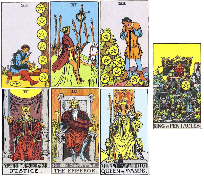 Ако отида - 8 Пентакли - занаят, иска концентрация, съсредоточаване и внимателно извършване на някакви действия. По Шестица Жезли виждам себе си не като човека на коня, а като някой от тези хора отзад, с моливче в ръка, но определено съм масовка. По Седмица Пентакли - очакван резултат, не съм започнала да рисувам по-добре, нито ми е станало по-интересно.