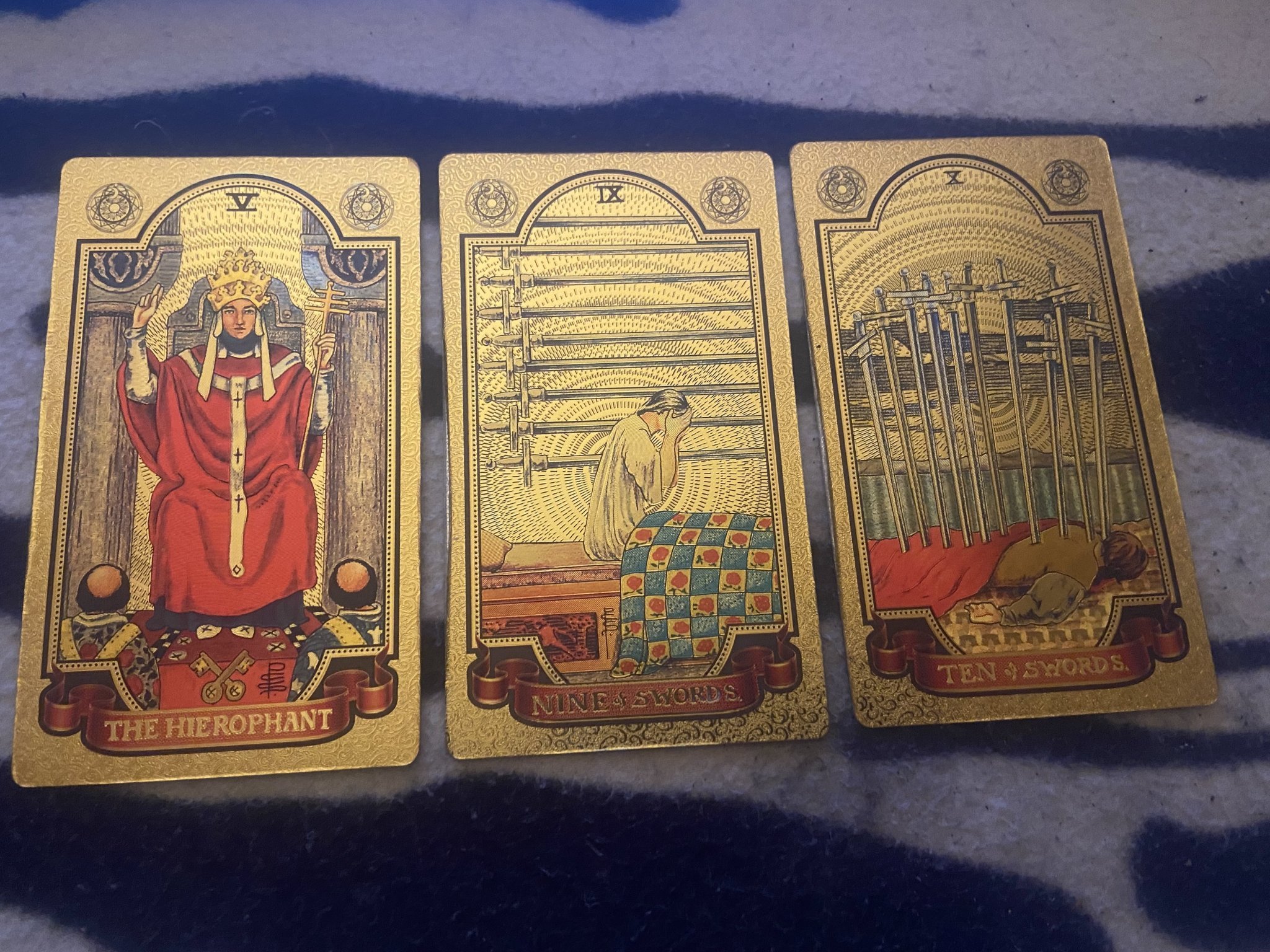 Другите две карти ме навеждат на мисълта за изневяра или по скоро съмнения за такава. Определено има предателство от едната страна, което е наранило другата страна. Много харесвам тълкуването на 10ка мечове като правене от мухата слон за някакви проблеми. Това ме навежда на мисълта, че по скоро става въпрос за съмнение за някакво предателство/изневяра, а реалността всъщност не е такава.