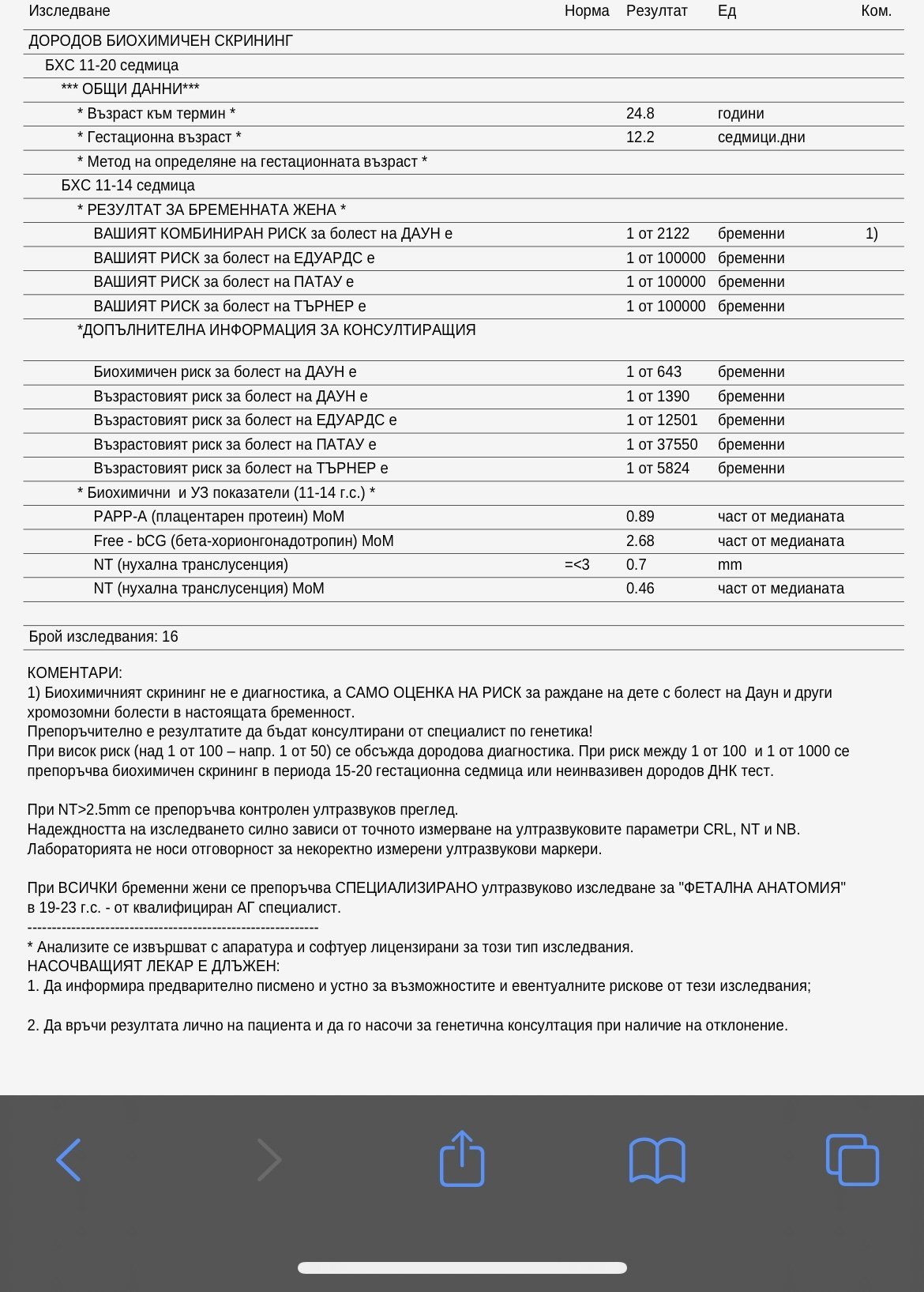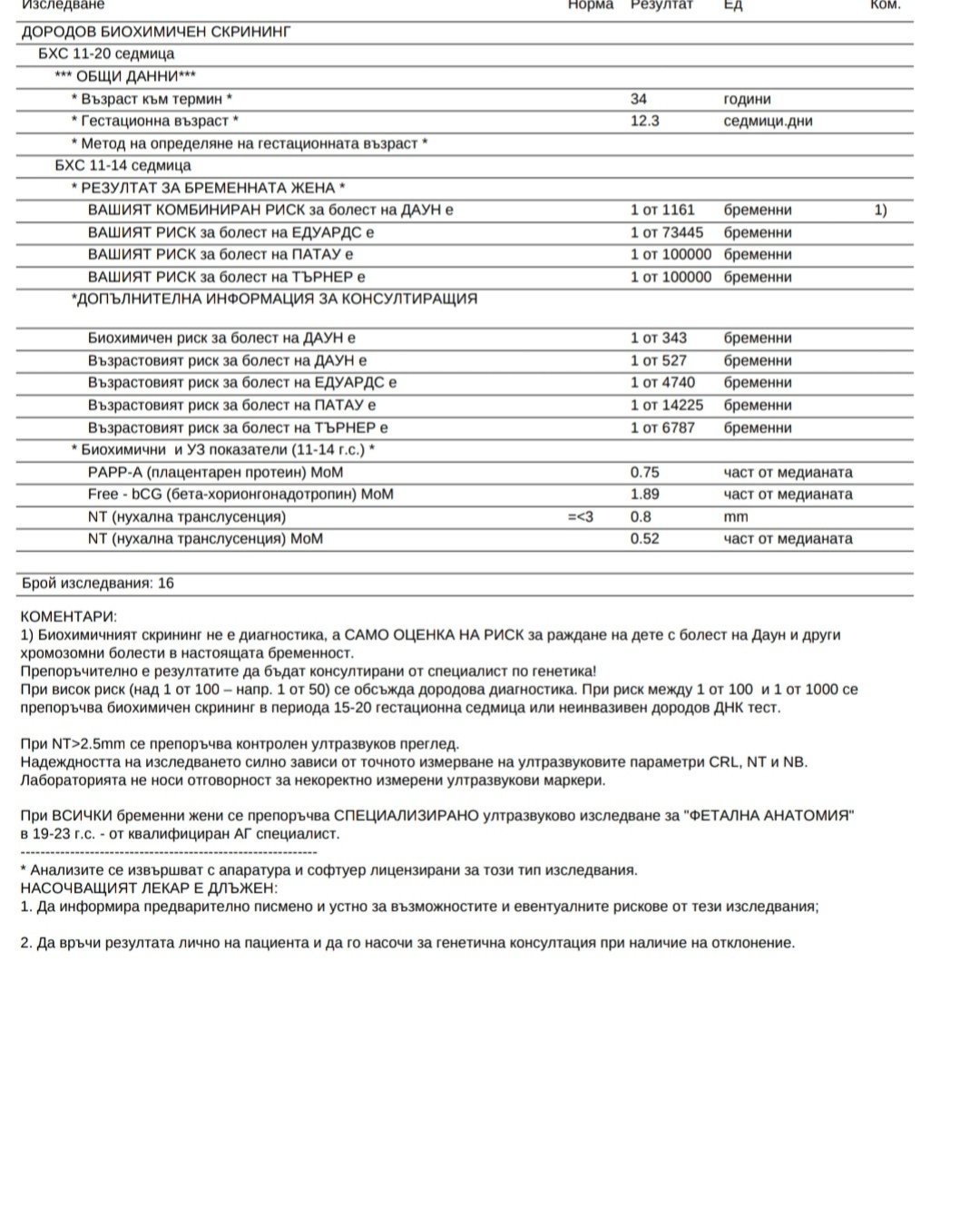 Нормалните стойности за бета HCG и PAAPP-A варират в зависимост от гестационната седмица. Идеалният МоМ (материал, който изразява съотношението на стойностите) е 1, а завишените стойности могат да показват повишен риск от синдром на Даун. При определяне на риска е важно да се вземат предвид и ехографските находки, а не само биохимичните стойности.