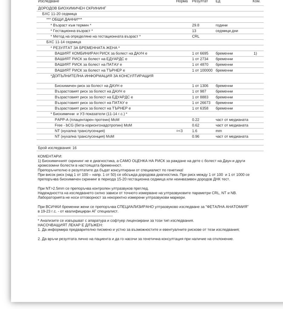 Нормалните стойности за бета HCG и PAAPP-A варират в зависимост от гестационната седмица. Идеалният МоМ (материал, който изразява съотношението на стойностите) е 1, а завишените стойности могат да показват повишен риск от синдром на Даун. При определяне на риска е важно да се вземат предвид и ехографските находки, а не само биохимичните стойности.