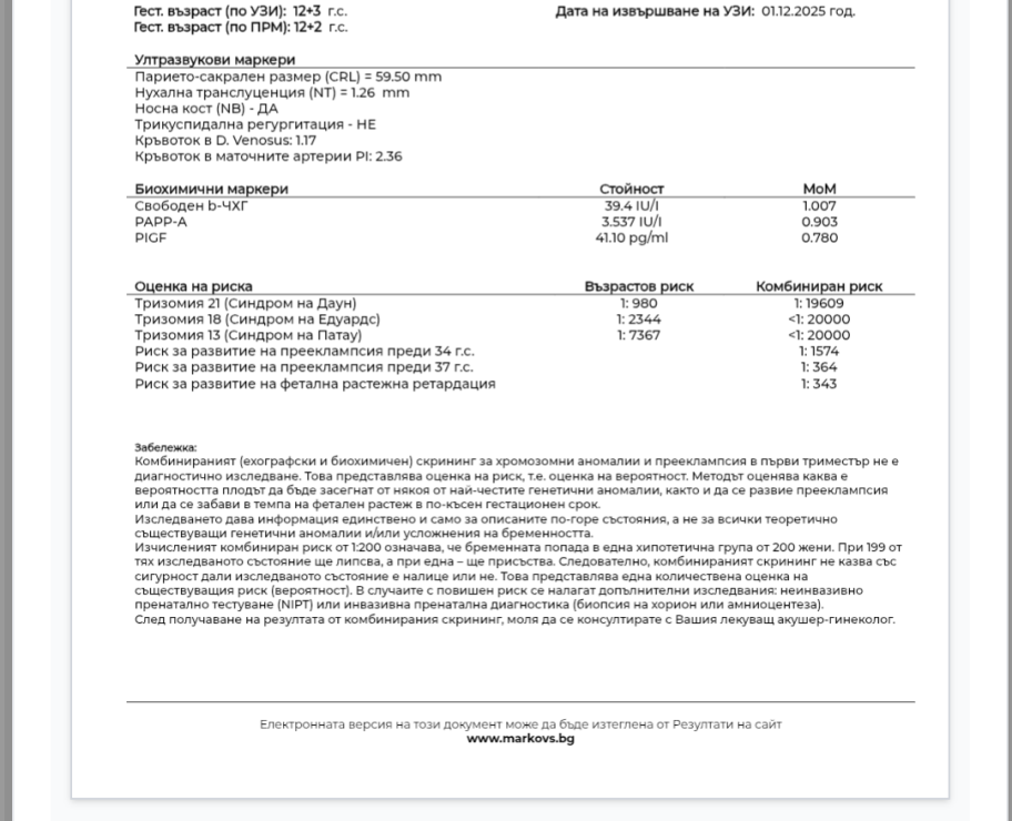 Е пуснах си резултатите и освен, че не виждам резултат за риск от прееклампсия, стойностите за синдром на Даун направо ме втрещиха, както и резултата на bCG.