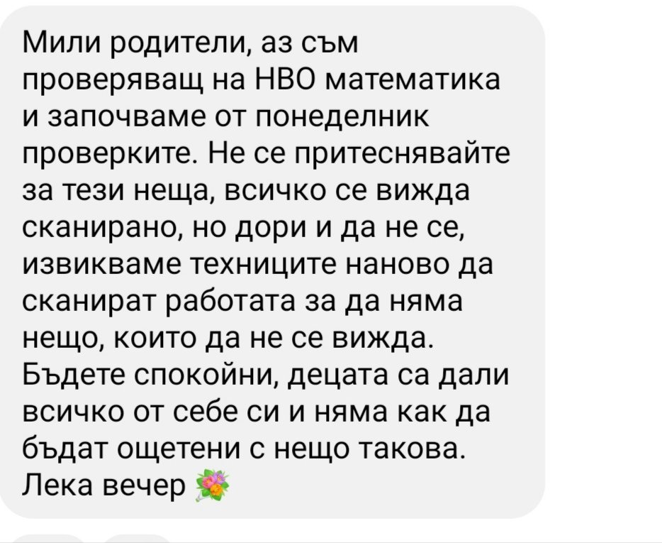 Аз мога само да изкажа благодарности на ръководството на нашето училище (евентуално и РУО) за организацията за НВО - услужливи, разбрани и компетентни квестори, максимално спокойна обстановка, имайки предвид стреса от самите изпити!