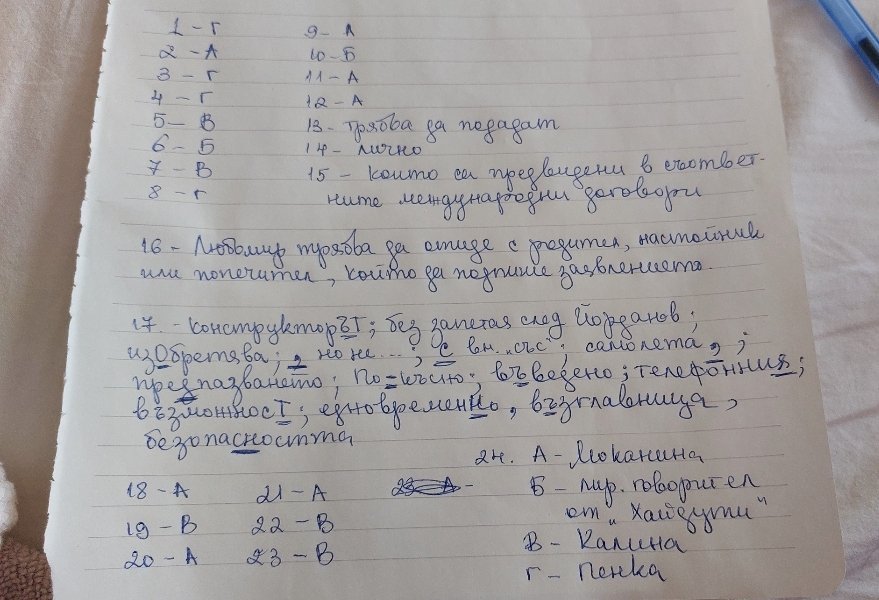 Моя се прибра с кариран лист, чернова та, на който написал отговорите на теста, да ги проверим. Другия лист чернова ги събирали на обща купчинка. Няма печат листа.