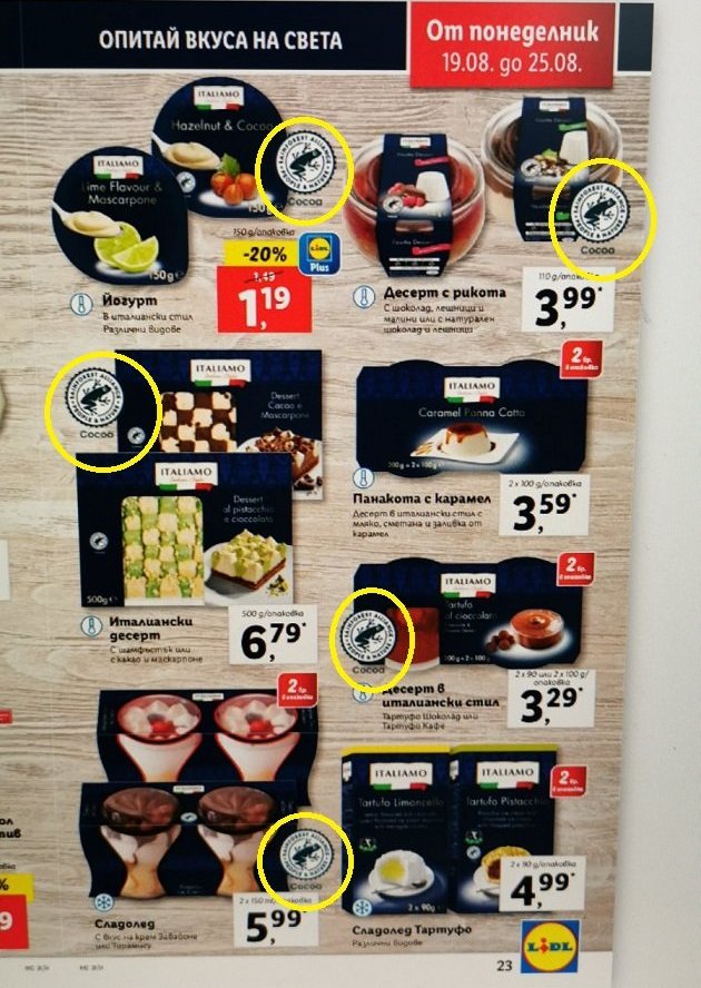 Това е знакът на The Rainforest Alliance и изобразен на даден продукт означава, че той е произведен с грижа към опазването на околната среда и биоразнообразието, а също че заетите в производството са възнаградени достойно и им е осигурена подходяща среда на работа.