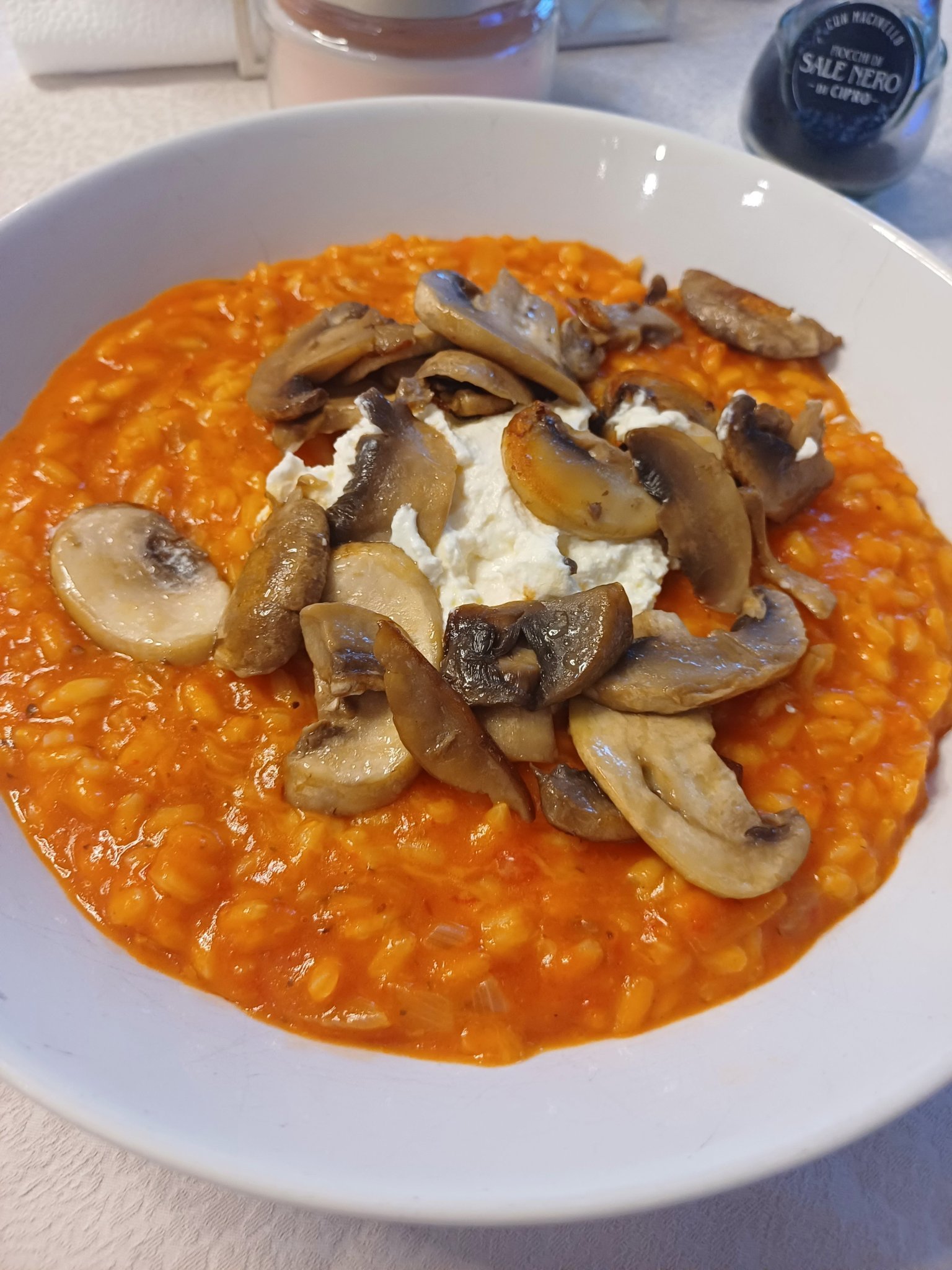 Ризото с печен доматен сос, рикота и гъби. Рецептата съм я взаимствала от фейсбук от By Velcheva. Тази жена я открих наскоро, има невероятни рецепти, самата тя е много интересна личност, живее във Валенсия и се занимава с производство на свещи и аромати от висок клас за дома. Дано не звучи, като реклама само, но аз много се впечатлих от нея.