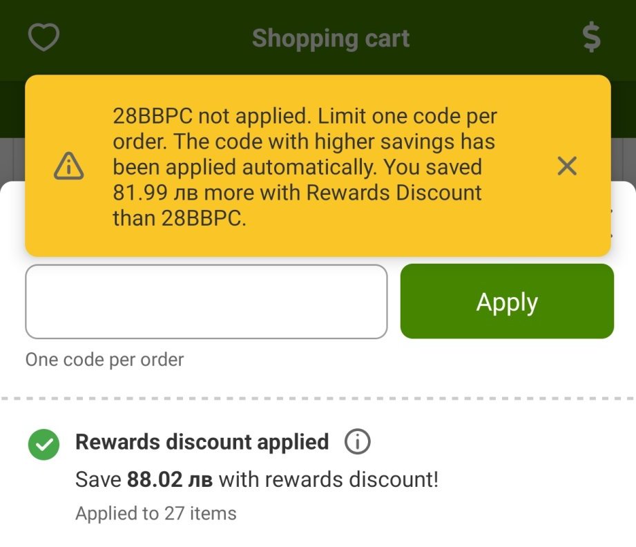 Персонализираният код за отстъпка предоставя 10% отстъпка при първа поръчка и 5% при последващи. Кодът е уникален за всеки потребител и когато се използва, както потребителят, така и притежателят на кода печелят бонуси. Кодът може да бъде въведен многократно, но за да се избегнат конфликти с други кодове, препоръчително е да се прилага последен преди завършване на покупката.