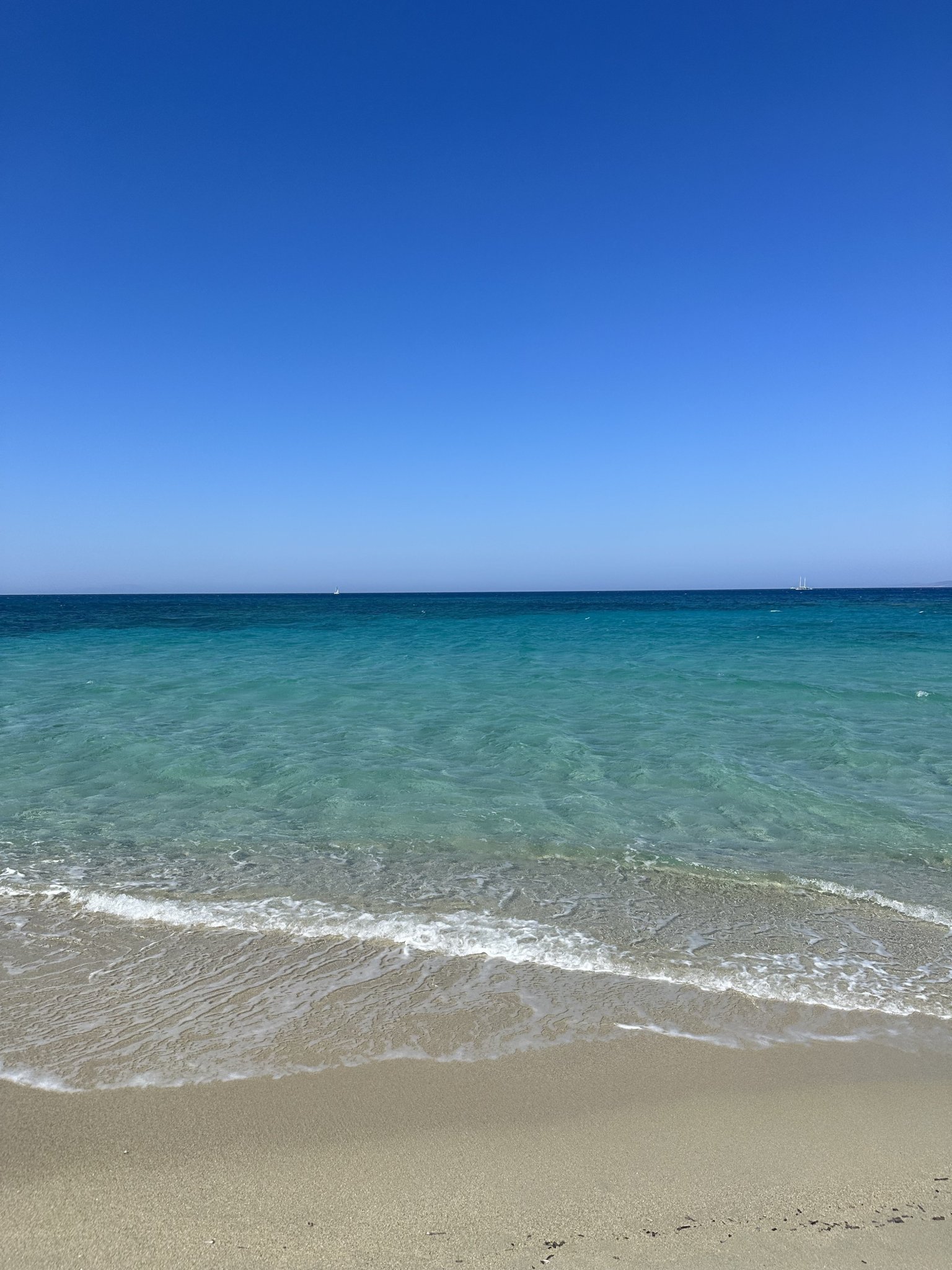 Спокойно, цикади цвърчат, малко по-едър пясък, който не ти се лепи навсякъде, топла прозрачна вода, чадър и шезлонги, шатра - срещу консумация, без минимална сума. Двойно кафе и фрапе - по-малко от 5 евро.