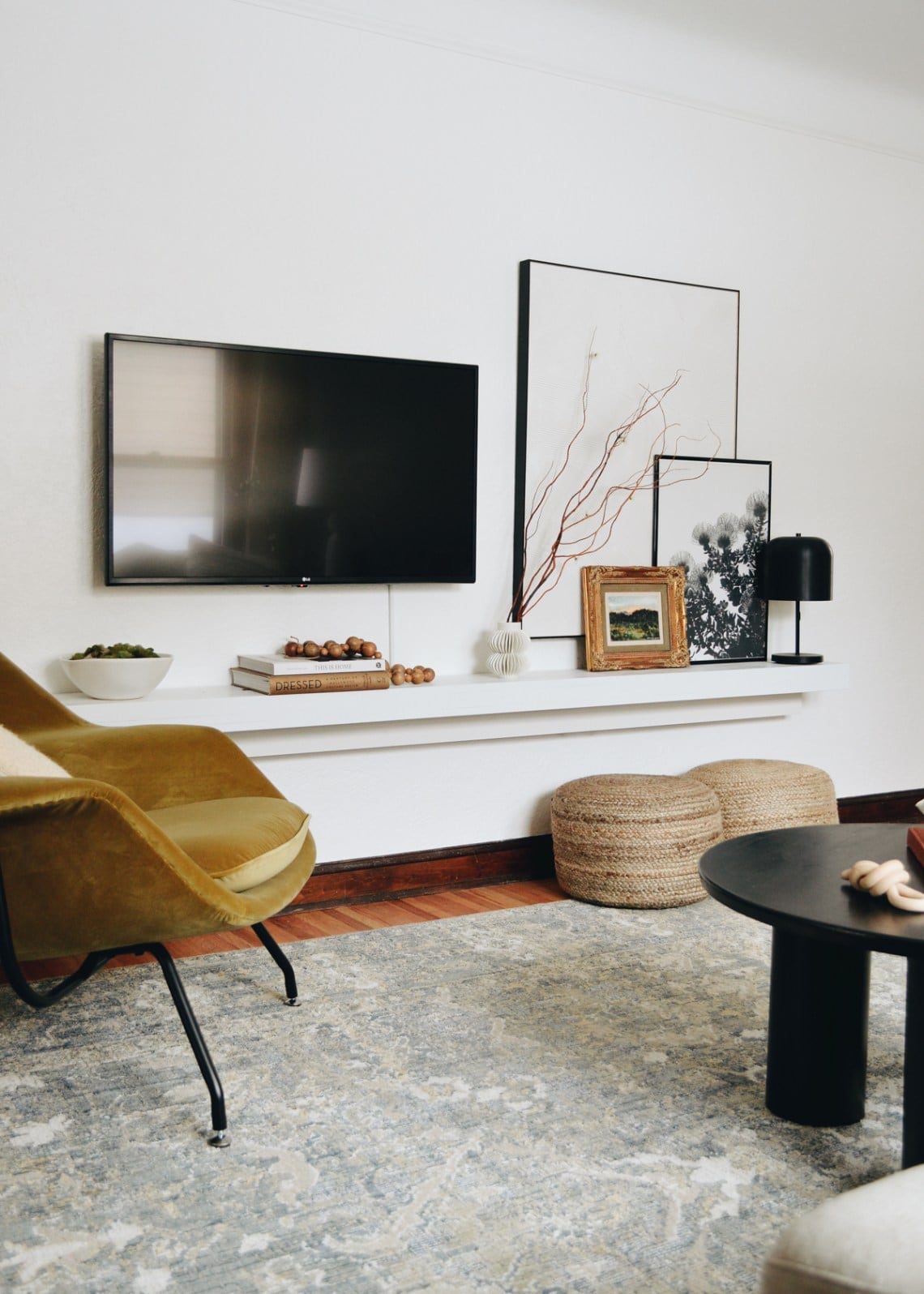 На мен ми се струва, че ви е много малко шкафчето под тв и по негова вина се получава дисбаланс на пропорциите на тази иначе дълга стена.