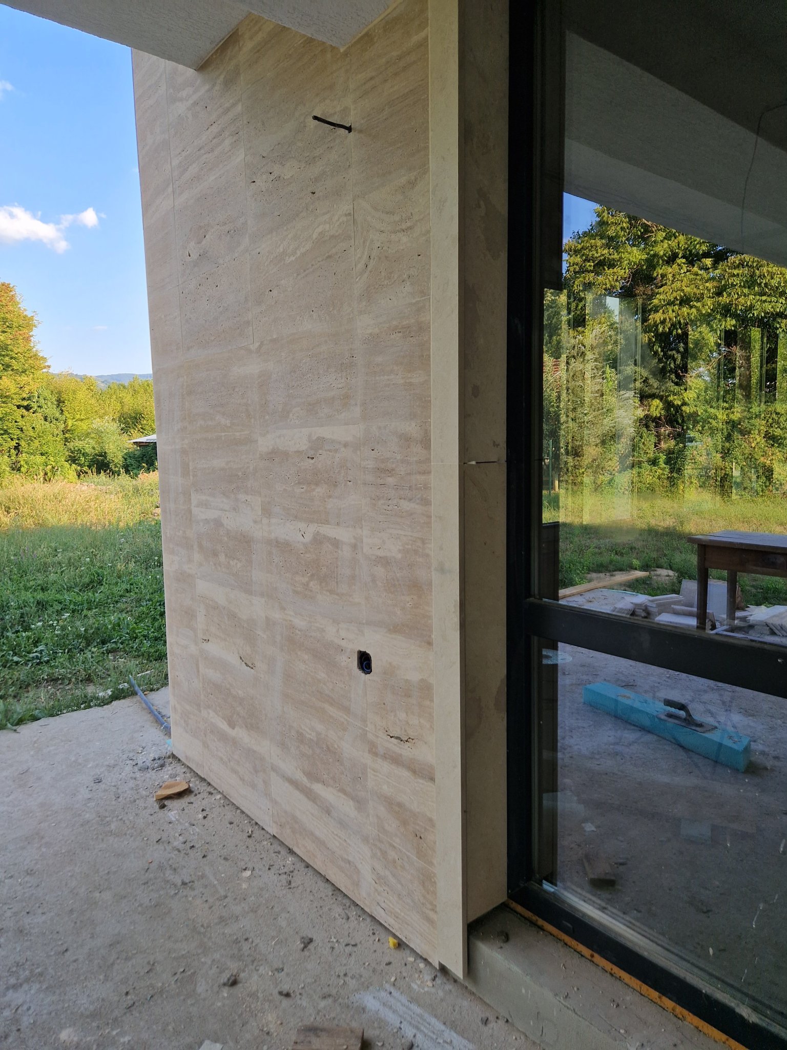 Да, стените ще са от естествен камък травертин, както и почти цялата фасада. Прилагам снимка от верандата.