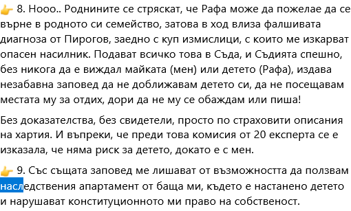 С ръка на сърцето си казвам, че детето не съм го докосвала. То самото е разпитано многократно и никога не е споделяло подобни неща. Но съдията, без да ме познава, четейки тези ужасии и всичко подплатено с ФАЛШИВА ДИАГНОЗА от водещо болнично заведение (няма да го споменавам, но се прочу със случая Даная), в ЗАКРИТО ЗАСЕДАНИЕ издава заповед за незабавна защита на Рафаел. И аз се оказвам в ситуация - докажи, че си невинен. За дело, два месеца след връчената ми заповед. Значи аз два месеца не мога да се обаждам и да чувам как е детето ми, защото “мога да бъде арестувана и да вляза в наказателно дело”.