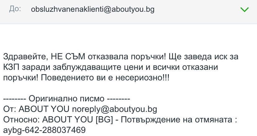 Всяка пратка от AboutYou включва документ за връщане, съдържащ описание на продуктите и товарителница. За да върнете артикул, поставете го в оригиналната опаковка или друга, като не е задължително да имате оригиналната. Прикрепете етикета за връщане към пратката и я предайте в офис на Еконт или поръчайте куриерска услуга, ако желаете да вземе артикула от дома ви. След като артикулът бъде получен и проверен от AboutYou, парите ще бъдат възстановени в рамките на 14 дни.