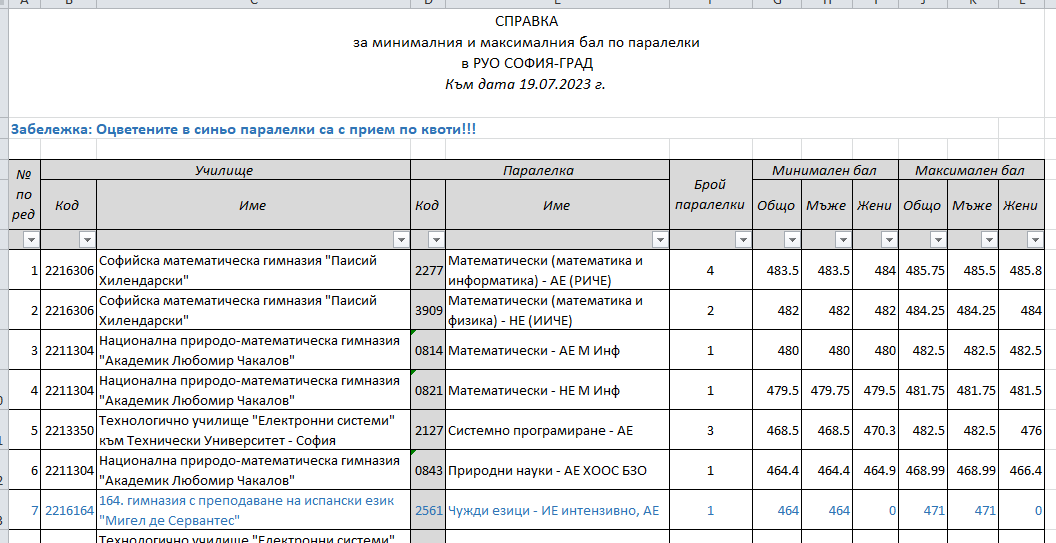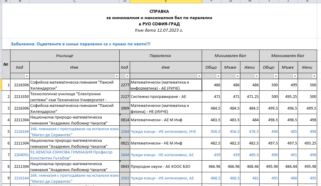 Или просто се ориентираш спрямо последните две-три години към паралелки, които са били с по-нисък бал от бала на детето. На "изпитай ме" за София дава интересна информация на база второ класиране миналата година къде би се класирало детето, с какъв бал и какъв е бил минималният бал за момичета и за момчета. Което не значи да не бъдат включени и желанията на детето, освен ако разминаването не е 100-200 точки. Въпреки това на щерката й посочи, че би влязла испански в "Мигел де Сервантес" - явно на второ класиране не е имало момиче, а е имало място. За момче е бил 484. Шанс, от който някой не е успял да се възползва явно. И явно е изключение, на фона на другите предложения