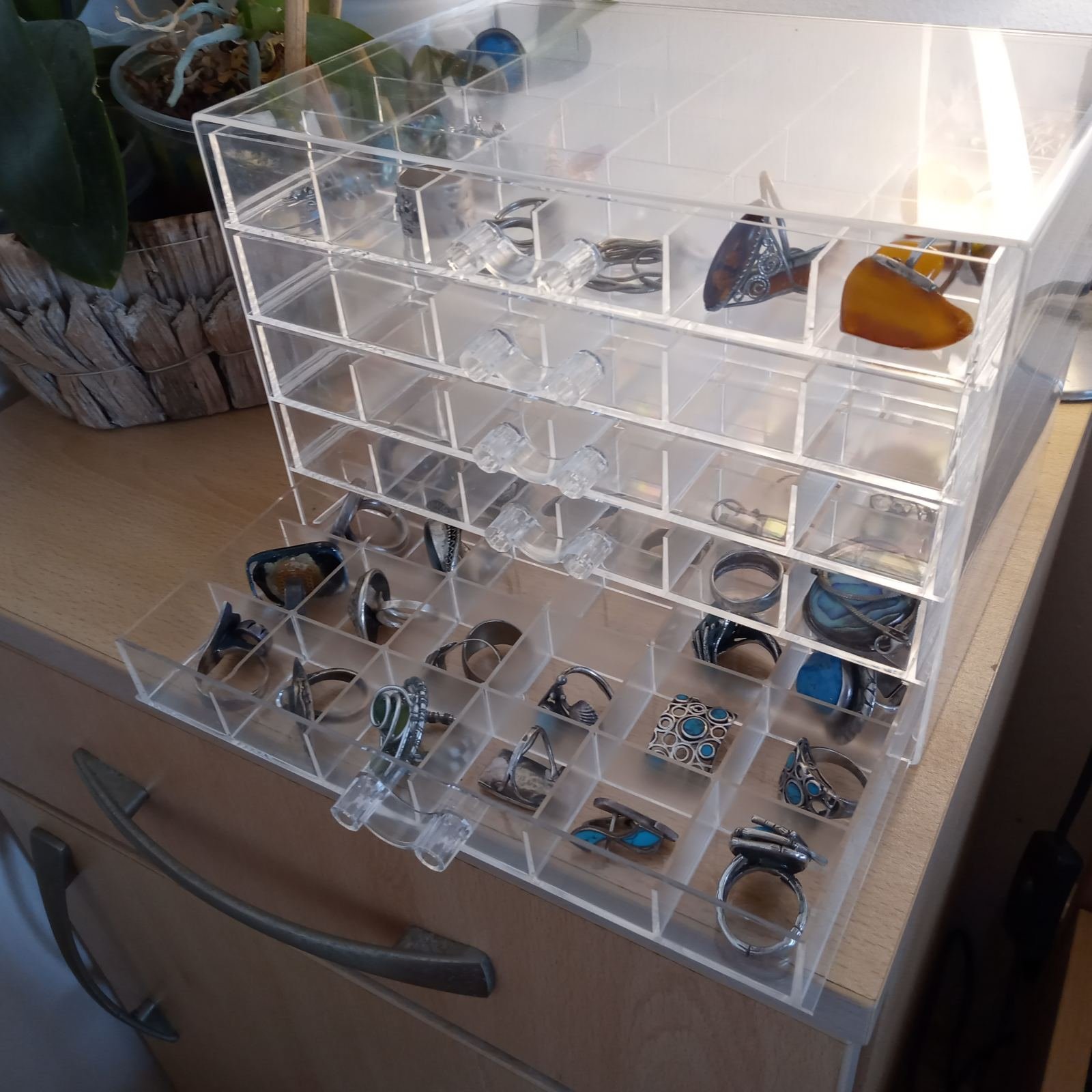 Я, това изглежда много добро, не бих отказала линк да го прегледам по-подробно. Имам страшно много пръстени и обеци които не са сребро или стомана, съответно гледам да ги съхранявам всяко отделно че ако ги омешам ще си сменят цвета набързо. Имам подобно нещо, но не е чак така разделено ами съм си го пригодила аз, но му мисля как още да го подобря.