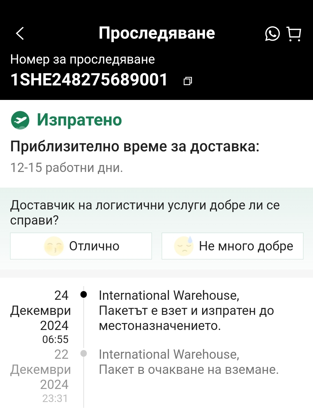 Някой получавал ли е пратка с куриер различен от Спиди ? Направих поръчка и на имейла получих известие, че номерът за проследяване е този 1SHE248275689001. Като влезна в проследяване на поръчката от телефона си виждам това: