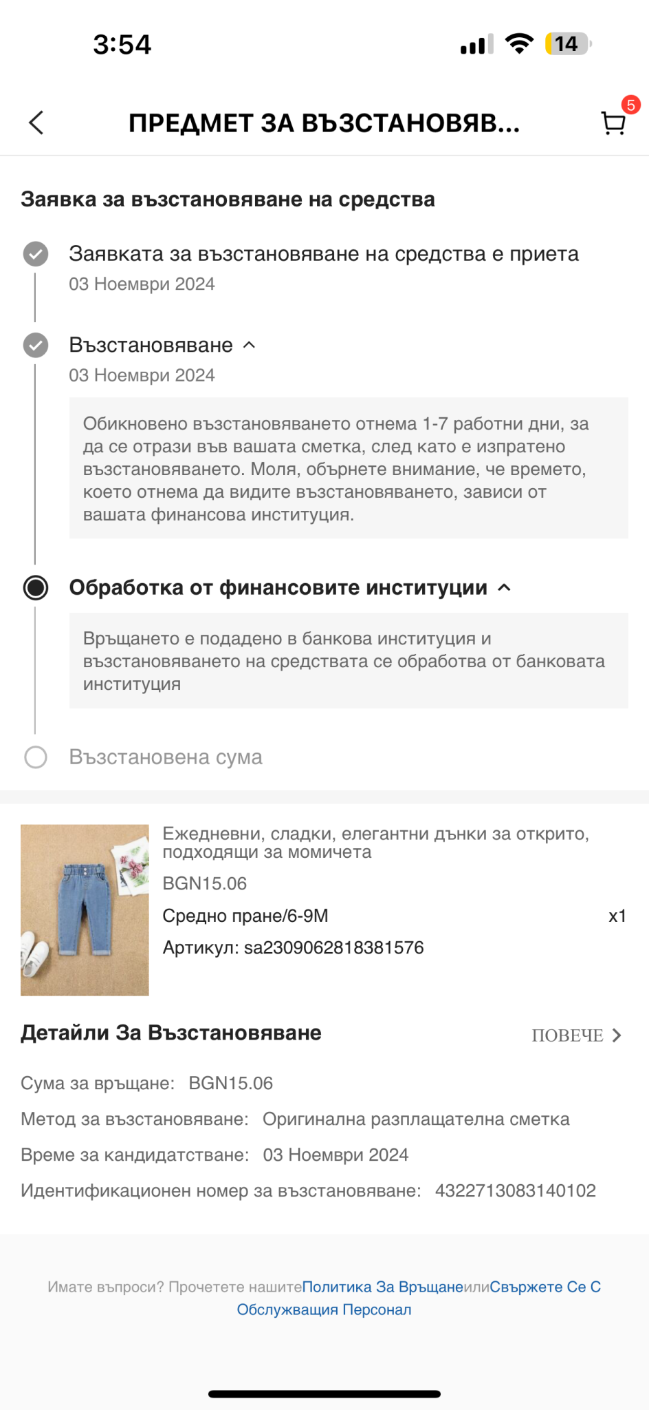 Здравейте! Включвам се набързо с един въпрос към дамите, които са получавали refund, не знам дали е коментирано назад в темите. Поръчах бебешки дънки от Шийн, но дойдоха грешен размер. Писах на съпорта, провериха случая, върнаха ми известие, че наистина са объркали номера и ме попитаха какво да правят. Поисках възстановяване на средства, което уж пише, че е подадено към банката, но в приложението на Булбанк мобайл ми излезе транцакзия (извършена от мен) с картата, в която е описана точно стойността на конкретната сума за възстановяване, както всеки пък като плащам артикули. Т.е транзакцията ми е със знак минус (парите са излезли от сметката). Някой с подобен казус? Да изчакам ли 1-2 дни или да им пиша отново?