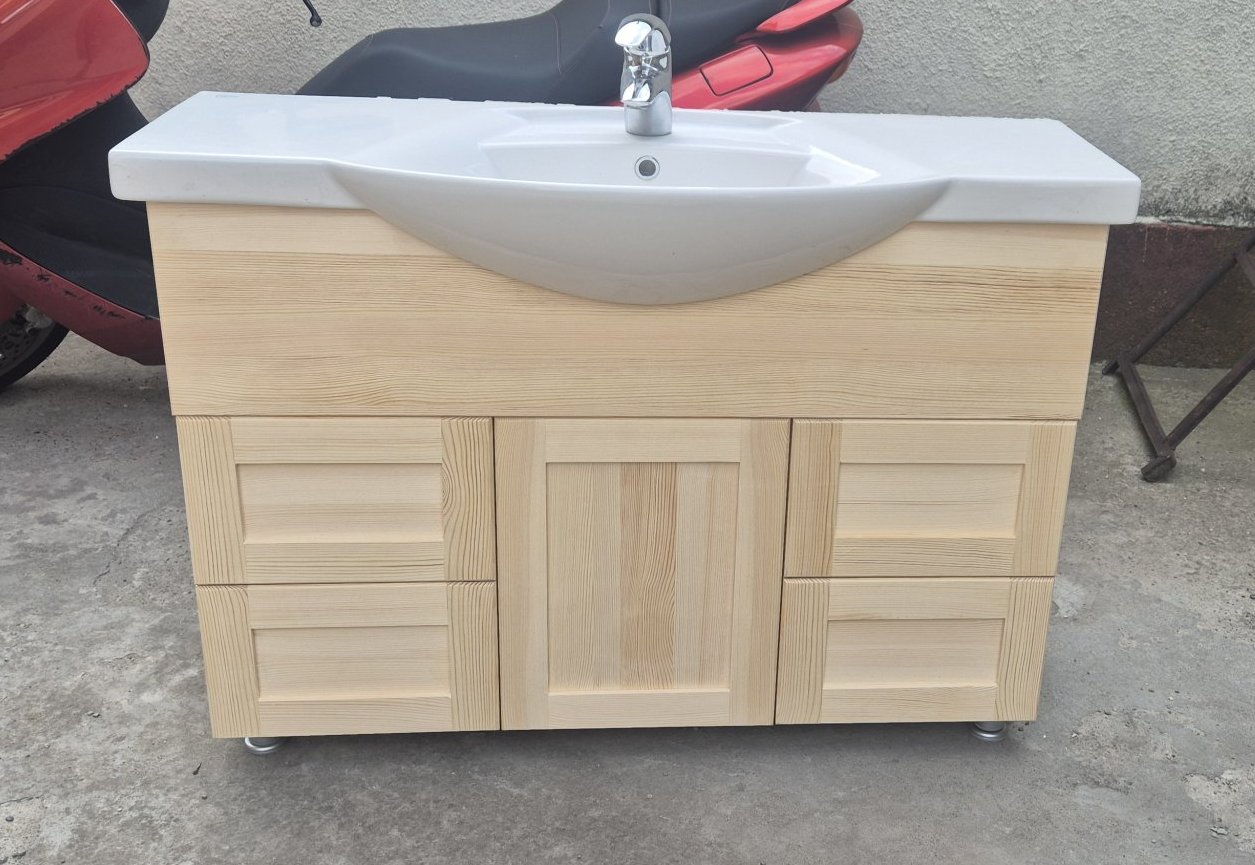 Банята е 1.1/3.1метра. Поддушовото е 1.1/0.8м. Тоалетната е вградена в стената, също и мястото с огледалото и шкафа. Шкафа е по поръчка естествено дърво. 1.1/0.3м, 350лв ми излезе без дръжките и аз съм го лакирала. Исках да е същото, като вратата.