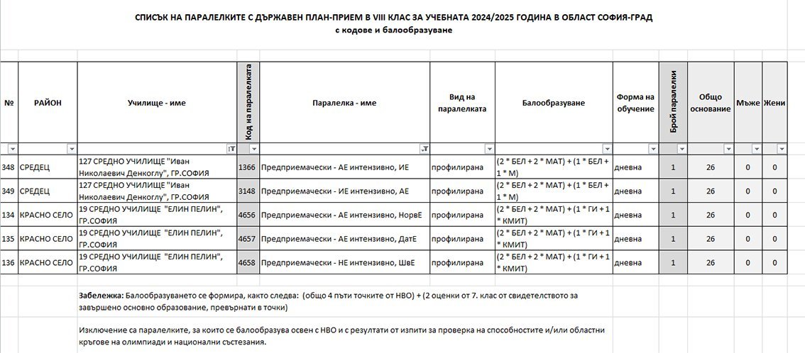 Аз сега докато се чудя какво да избираме и как да редя, забелязах че две паралелки, които ги е имало миналата година, сега ги няма като налични. Но изтрих директно редовете за да не ми се пречкат. Не помня училищата, но бяха езикови от "втори ешалон" с минимален бал около 380-400