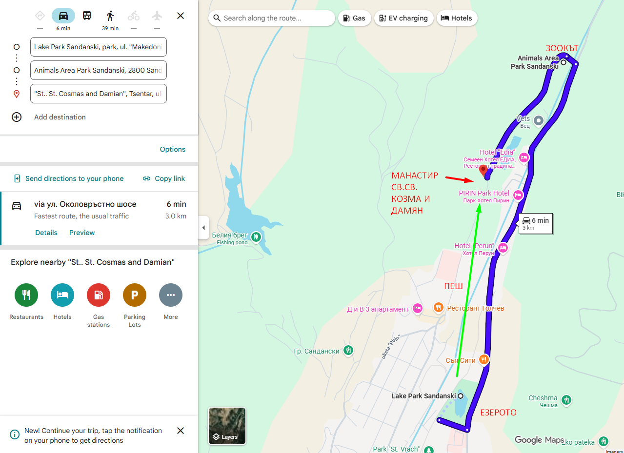 В зоокъта има алпака, няколко кенгурчета, сърни, кози, черни прасенца. Зоокътът така е направен че пътеката за наблюдение е над самото място, в което са животните, така че ги гледате отгоре, не през ограда. Безплатен е - общината го поддържа. Манастирът е малък, но е в същата посока, отворен е до 16:00 ч. В него има и чешма, от която тече питейна пиринска вода и може да си налеете за пиене. До парка има и нещо като мини парк с къщичката на баба Яга. В парка има и лунапарк с виенско колело със затворени кабини, от които се вижда целият град и планината. Освен езерото с различни птици, в парка има и кът с пауни.
