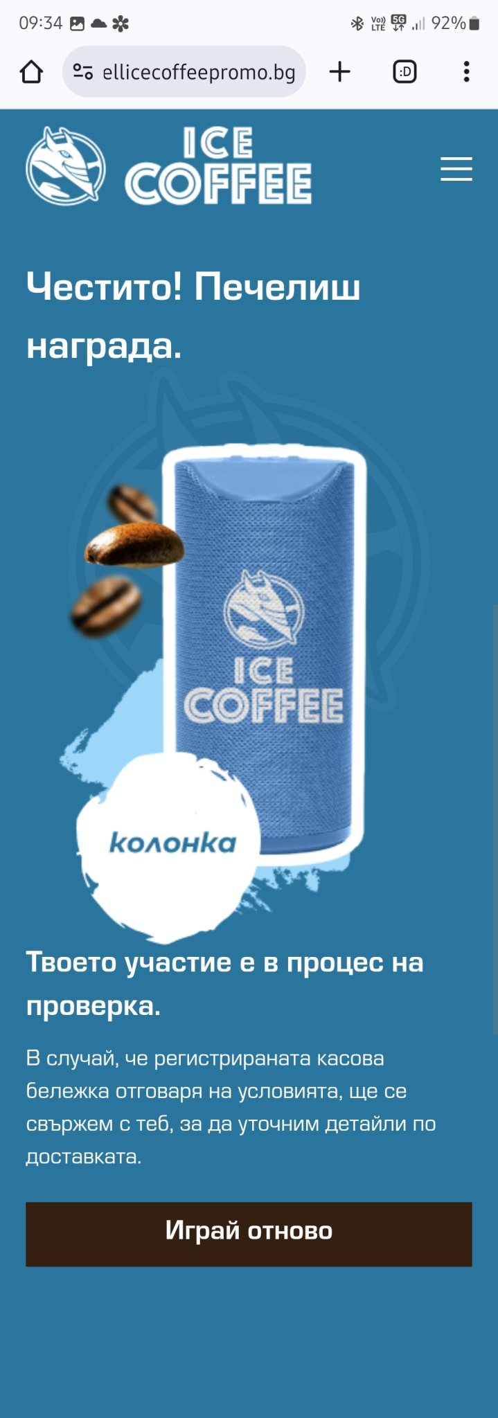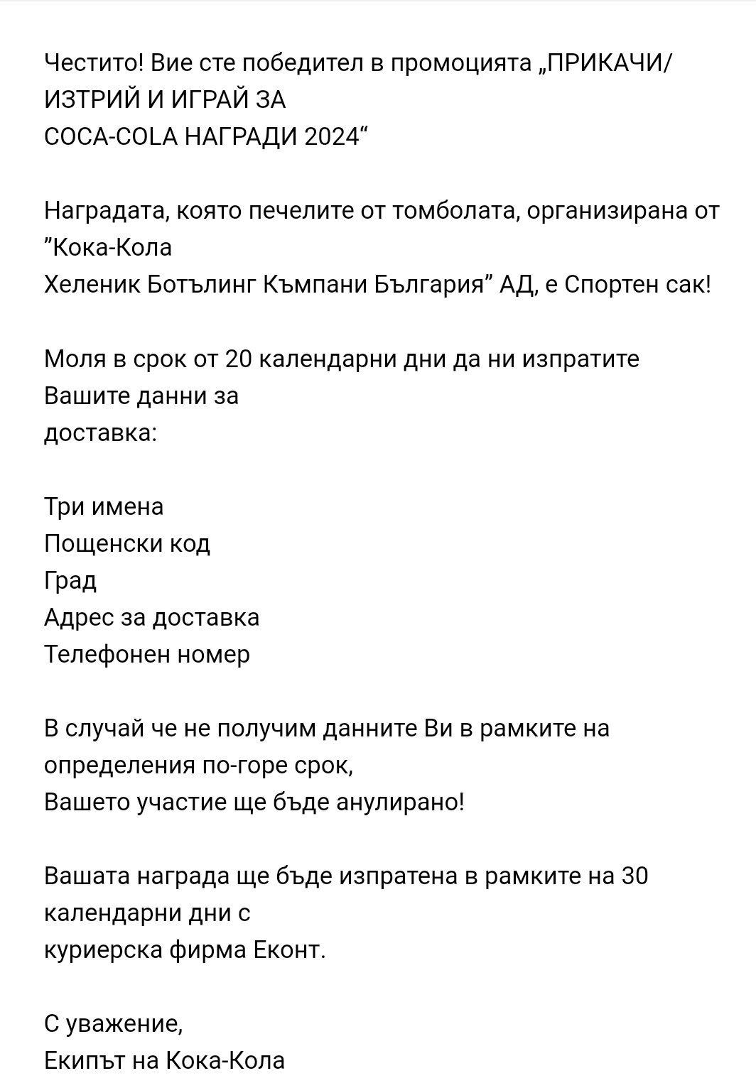Извиняваме се за получилото се забавяне поради независещи от нас обстоятелства, свързани с фирмата-доставчик. Ще получите наградата си в най-скоро време.