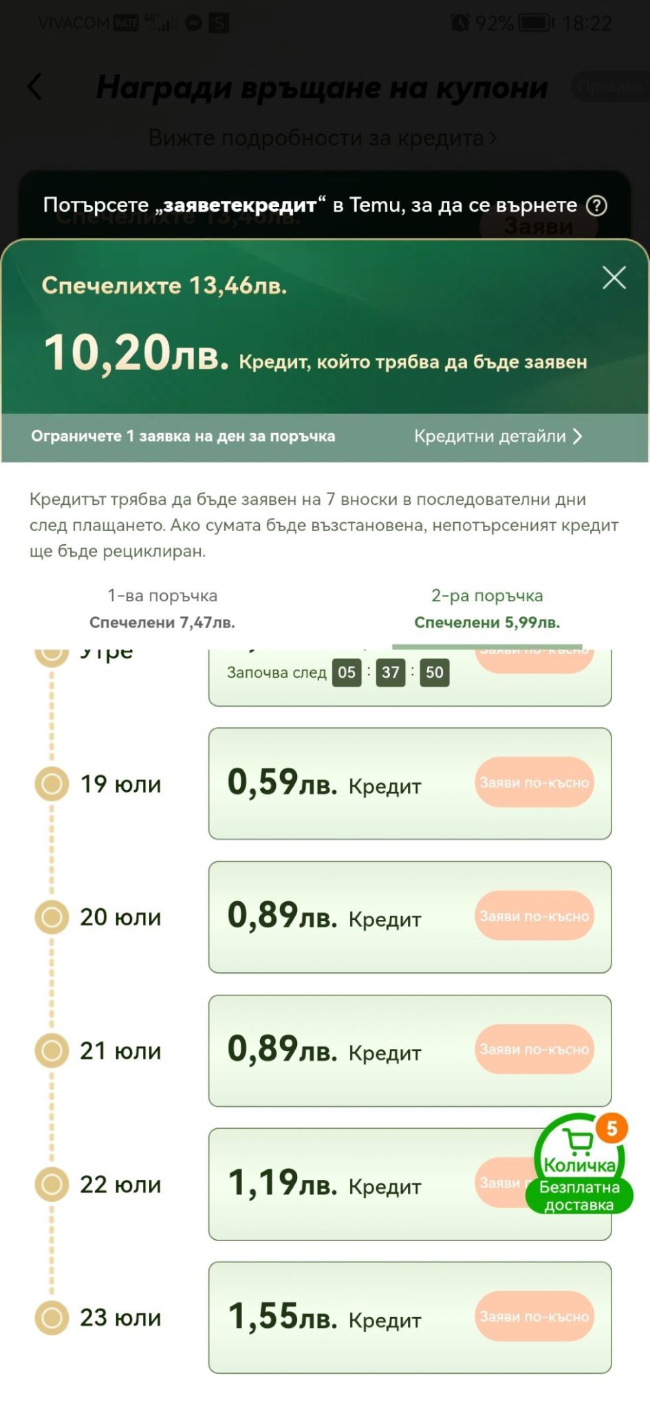 Не този кредит е от оферта предоставена Ви от Тему - при мен беше да избера стоки от тяхна селекция /някои бяха от моята количка, други не/ за минимум 20 лв. и  30% от похарчената сума се възстановява на части в рамките на 7 дни. Всеки ден трябва да си натискате това бутонче-заяви кредит. Не е нужно да правите нова поръчка , само да си поискате сумата.
