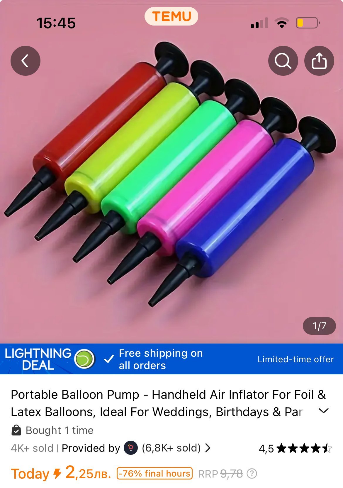 Ние имахме обратния случай, за РД на детето купихме от Тему точно фолиеви балони, а се оказа, че помпа нямаме. Съпругът ми по спешност отиде и купи една от магазин за 1 лв., струваше 2 лева и излязохме от ситуация. Иначе щеше да има много разочаровани.