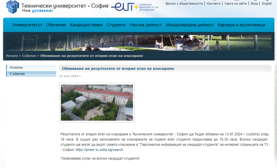 Записването в ТУ е до 12.07.2024 г., до тази дата е и заявавянето за участие във второ класиране.