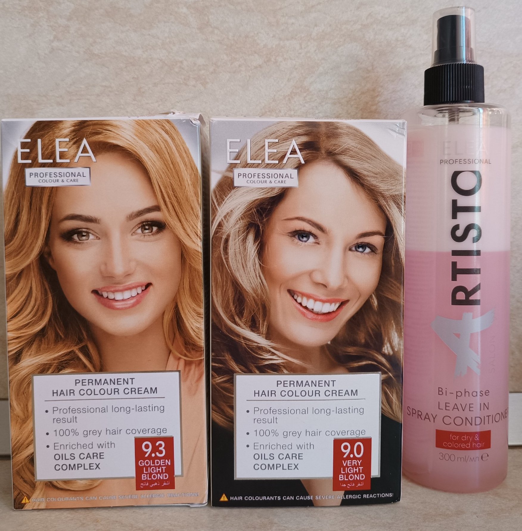 За обезцветяване, марката ELEA предлага два варианта. Класически блондор с прахообразен обезцветител - 0/0 Изсветлител за коса супер блонд, който изсветлява косата до 6 тона или по-щадящ вариант - 0/00 Кремообразен изсветлител за коса, който изсветлява до 4 тона. Преценете внимателно кой от двата продукта би бил по-подходящ за вас и имайте предвид, че обезцветяването по-принцип е по-агресивна процедура и трябва да бъдете внимателни с времето на престой на продукта върху косата.