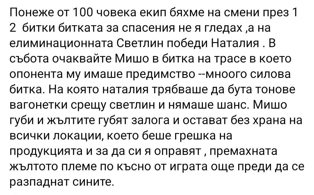 Инак бях чул, че имало някаква врътка на един от червените съвети, но дали е точно на този или някой от следващите, както и това дали ще излъчат всичко, още не знам. От друга страна Борисенко да се откаже от имунитета си би решил конфликта на тези два противоречащи се спойлери, че едновременно Анита и Стан влизат в основните племена. По мое лично мнение, спойлерът на Мери е верният, а този на "човека от ФБ" не е, но след няколко часа ще знаем със сигурност