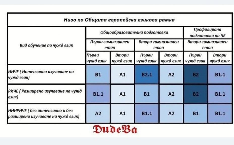 Тази таблица за съжаление е продукт на МОНски мечти или може би изпълняване на хартия на Европейски препоръки. От първо лице имам поглед над уменията за възпроизвеждане (писане и говорене) на англ. ез. като първи чужд ООП в 12ти клас, само училищна подготовка и получавани 6-ци за оценки. Ниско В1 може би, много базови езикови конструкции и изказ. От моя гл. точка хорариумът за петте години не е бил оползотворен по смислен начин. Но това беше коментирано по-рано - в СМГ език не се научава. Който иска прилично ниво или има нужда от сертификати - трябва да учи допълнително.