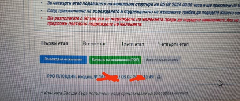 Здравейте!Първо да пожелая успех на всички деца!Пиша за първи път и се извинявам  за тъпия въпрос,но на вас излезе ли ви,че заявлението ви е прието успешно,както е показано в инструкциите?При нас излезе само вх. ном и дата и като го дам за печат няма нищо попълнено  по точка Б,В,Г.Дали при всички е така.Извинявам се още веднъж,но ни е за първи път.Благодаря.