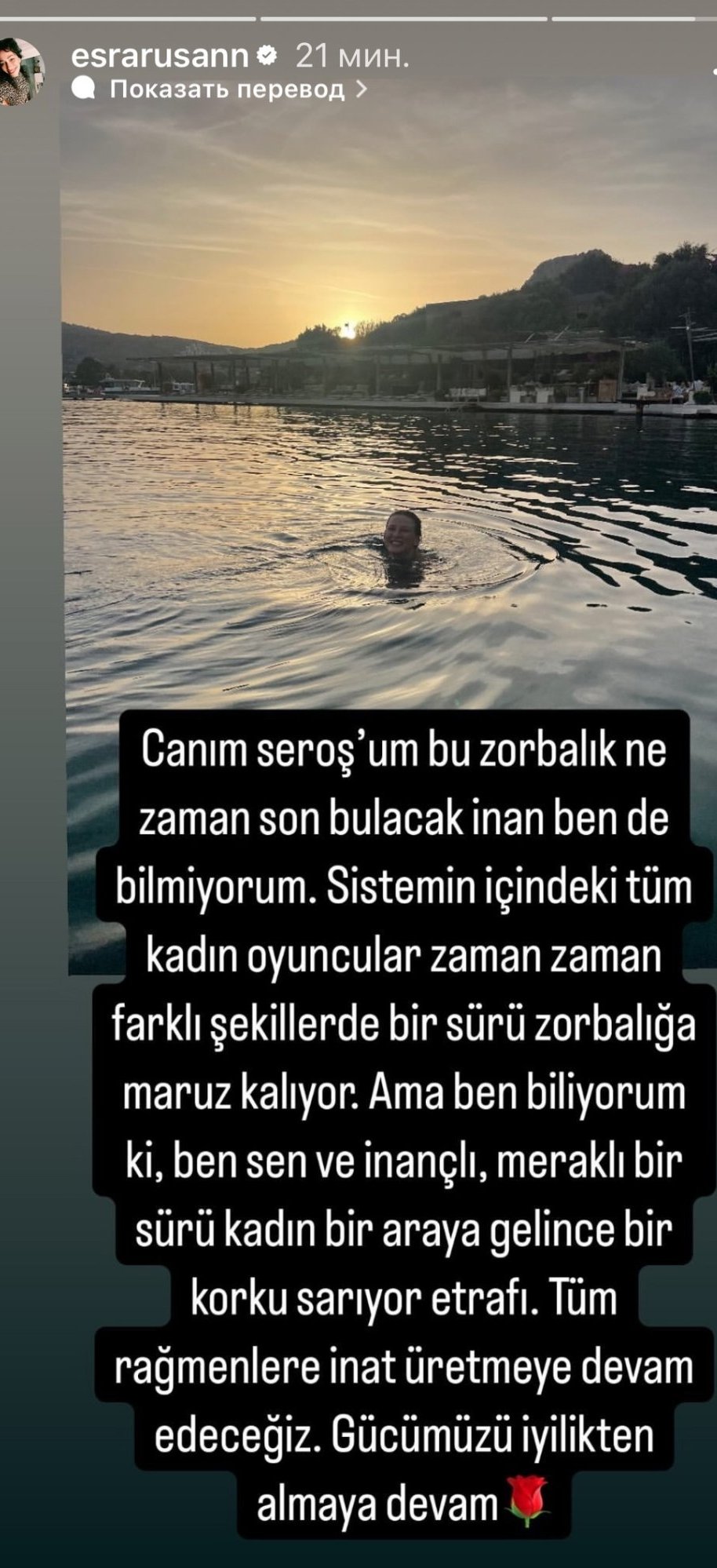 „Скъпа моя Серош, не знам кога ще свърши тази подигравка. Всички актриси от време на време изпитват различни форми на насилие в системата. Но знам, че когато ти, аз и много верни и любопитни жени се съберем заедно, страхът ни заобикаля. Ще продължим да упорстваме каквото и да става. Продължаваме да черпим сила от доброто 🌹”
