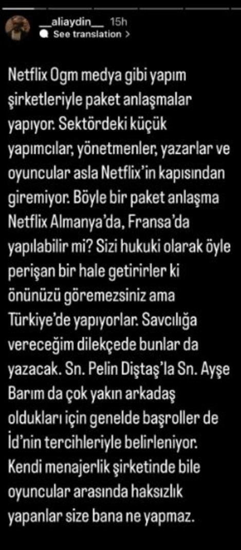 Ако Айше Баръм не беше доминирала в индустрията, щяха ли да дадат главните роли на вашите блестящи млади приятелки актриси, постигнали голям успех в театъра? Ще го предадат на друг познат от друга агенция. Никой не поставя никакви "условия" на друг играч. Компаниите производители ги купуват на едро и си тръгват, за да избегнат ненужни проблеми. Също така, ако това е условие и продуцентската компания го приеме, тогава това е проблем на продуцента.