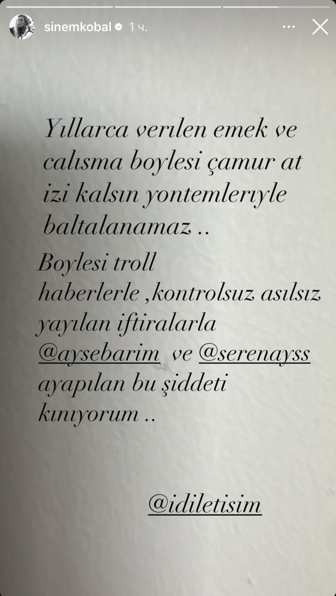 Осъждам това насилие, извършено от тролски новини и неконтролирана, неоснователна клевета срещу @айше баръм и @serenayss ..”