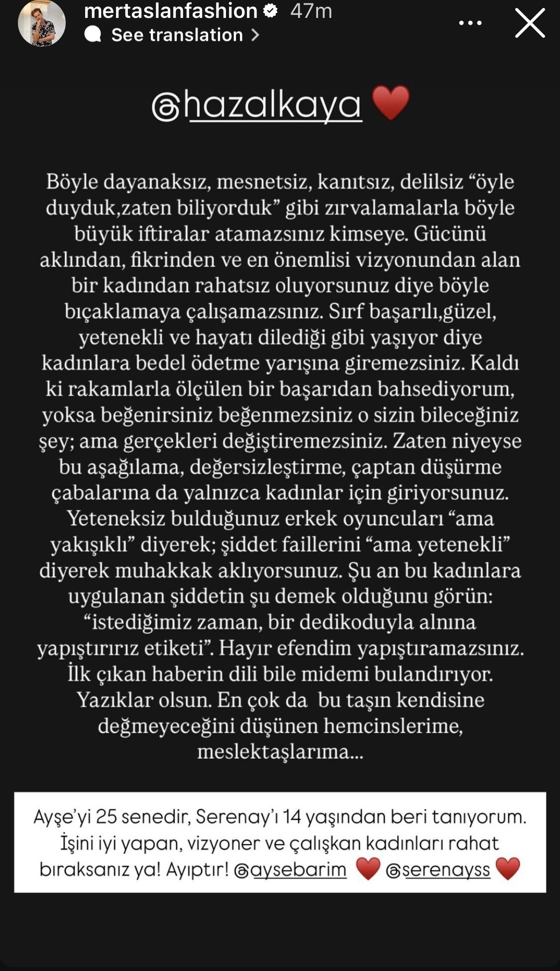 От Мерт Аслан : Познавам Айше от 25 години, Серенай от 14-годишна. Оставете на мира тези далновидни и трудолюбиви жени, които си вършат добре работата! Засрамете се! @aysebarim @serenayss