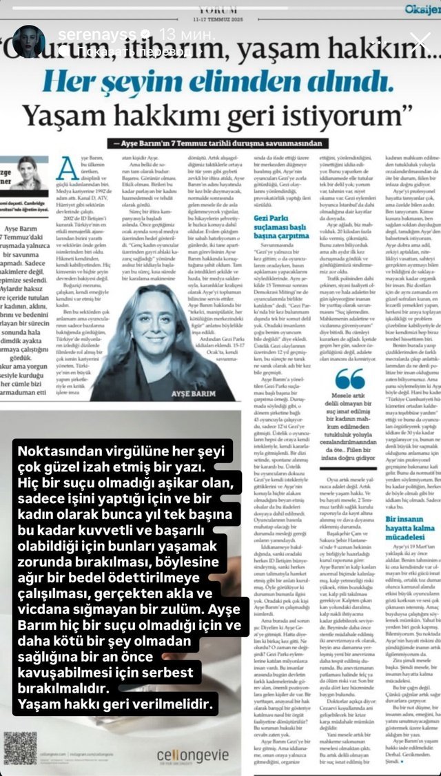 „Статия, която обяснява всичко много добре от точка до запетая. Истинска несправедливост и безсрамна жестокост е, че тя е принудена да преминава през всичко това, когато е очевидно невинна и просто си върши работата, и тъй като е била силна и успешна жена в продължение на много години, е принудена да плати толкова висока цена. Айше Баръм трябва да бъде освободена, защото е невинна и за да може да възстанови здравето си възможно най-скоро, преди да се случи нещо по-лошо.“